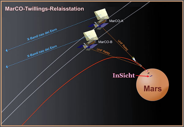 Bi dat Induuken un Affstiegen in dei Marsatmosphäre un bi't Landen schall dei Landeapparaot Daoten up dat UHF-Funkband an den Nasa Mars Reconnaissance Orbiter (MRO) senden, dei denn äöwer den Apparaot langers flügg. MRO kann dei Landeinformationen äöwer dat X-Band an dei Eern wiederleiten. Dei MRO kann nich gliektiedig Daoten annähmen un affsenden, dat mutt immer in'n Wessel gaohn. Dorbi helpet denn dei lüttken Paket-Satelliten ut. Dei beiden Paket-Satelliten sünd so utleggt, dat dei nao den