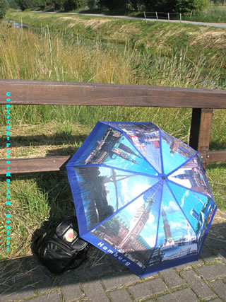 Ik gung nu de Trepp rünner, un statt na rechts to de Hüüs gung ik dütmal na links, rin in'ne Natur, de ik al vun baven vun'n Bahnstieg sehn heff. Eerst weer dat noch'n beten an Drüppeln, aver denn: de pure Sünnschien, un so kunn ik mien Rucksack mit'n Opklever vun Robin Wood "Gegen Atomkraft! Für erneuerbare Energie!" spazeeren dregen. Ofschoonst, op'n ganzen Weg heff ik man een Joggerin un twee Mannslüüd op'n Fohrrad drapen, de villicht dorop kieken kunn un över de Bottschap nadenken. Ansünsten weer ik alleen mit de veelen Vagels, de jümmerloos an singen weern. Un vör luuter Freud heff ik uk anfungen to singen: "Ich bin hinausgegangen, den Sonnenschein zu