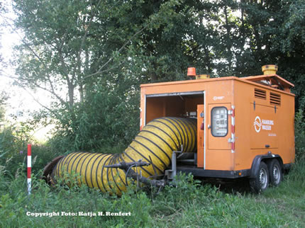 Eerst kort vör de neegste Bahnstation, Mittlerer Landweg, weern wedder Lüüd. Vun "Hamburg-Wasser" weern se an't Arbeiden. Se wüllt Leddern in de Waterschachten anbringen, hett een vun de beiden Mannslüüd mi vertellt.