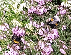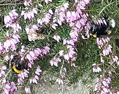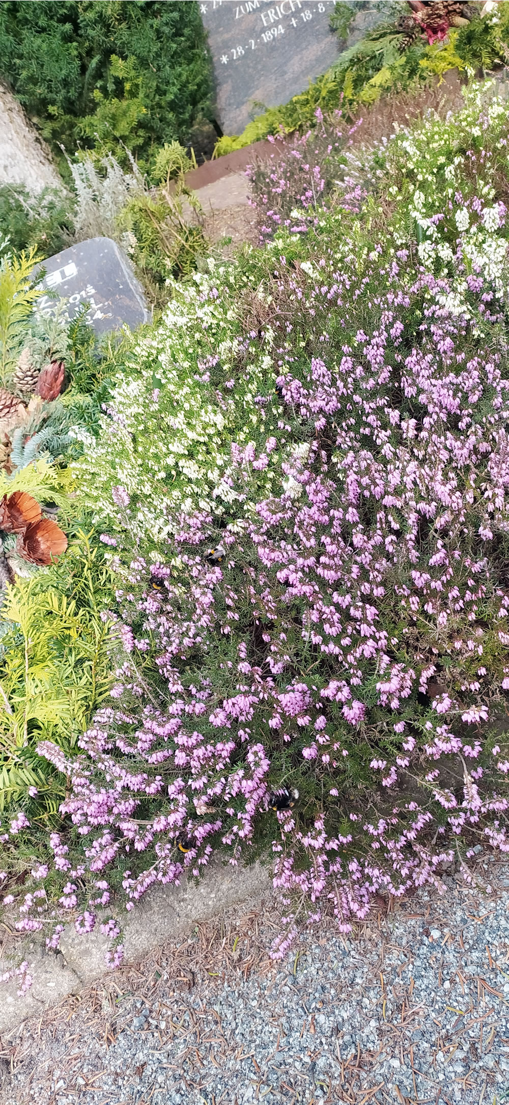 As na so'n langen Winter to verwachten weer, fangt nu miteens allens togliek an to blöhn. Un de Plüschmoorsen fleegt ok al, se köönt ja mit de restliche Köhl beter üm as de Immen. To ehr grote Begeistern blöht op'n Karkhoff ok noch en untiedig Heideaart. Na dor is avers wat los! Kannst söben, acht, negen Hummeln opmaal tellen, un in eensento kaamt welk hento un welk fleegt af. Un wat för Brummers dat sünd!!
