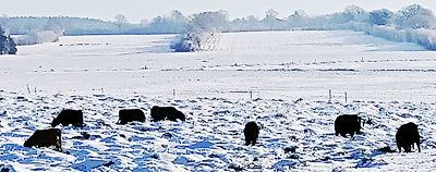 Nu daut dat endlich, un de swatten Rinder köönt endlich wedder den Borrn sehn! Teihn Daag hebbt se gedüllig in'n Snee wöhlt, ok wenn de Buur jüm wat hensmeten harr un de Snee dat glieks wedder todeckt hett. Ok de Waterbottich weer tofraren; dat Veh hett even Snee freten. De Natuur hett düsse Deerten so utstaffeert, dat jüm dat nix utmaakt. Längere Winter sünd fröher veel vörkamen, un wokeen denn op fleten Water anwiest weer, is eenfach utstorven. — Man liekers warrt se froh ween, wenn se bald wedder fleten Water drinken köönt! Dat Bild köönt Se per Klick vergröttern! Marlou Lessing |