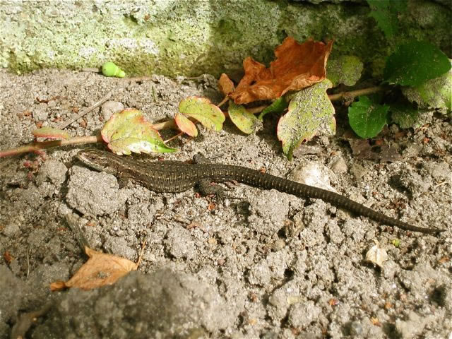 Hett Antje Hessler nich kortens vertellt, dat bi ehr an de Huuswand ein Poch leevt? so dach ik un luur so 'n beten an mien Huuswand rup. Un dor kunnst di ja meist verjagen dor seet in dat Wienloof an de Wand en lütt Draken, ene Echse, nee, ene Eidechse.
