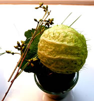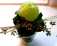 Teemlich dörchfroren möken mien Mann un ik up unsen Utfloog en Paus. Wi müssen uns eerstmal upwarmen. En lütt fien un smuck Kaffee in enen Park laad uns in. Wohlige Warms vun en Kachelaven keem uns glieks dörch de apen Döör in de Mööt. Up jeedeen Disch lüchen Talglichten. Wi harrn ja ok den 1.Advent! An enen Disch in de Neegde vun den warmen Aven funnen wi noch twee frie Stöhl. Eerst as wi uns enen heten Melkkoffi bestellt harrn, wöör ik de Dekoratschoon up den Disch richtig wies. Neven dat Talglicht stünn en hübsch trechmakten lütten Blomenpott. De weer mit Ziergräser un anner verscheden Blattwark utstafeert. Babenup in de Meern seet in hellgröön en Oort Bloom. De sehg meist en Kaktus liek. So'n Blomenpött stünnen ok up de Finsterbänk. De zart hellgröön un düstergröön Bläder möken sik goot up de witten Finsterbänk. Weern de Planten överhaupt echt un weer dat würklich en Bloom? Vörsichtig heff ik se anfaat. Echt weern se, aver dat Ganze weer gor keen Bloom. Dat weer blots en hellgröön meist dörchsichtig Fruchthüls mit luder lütte Stickeln. En Fruchthüls vun en Plant up de Finsterbank weer al platzt un lütte Samenkoorns mit en Fedder to'n Flegen as bi de Pusteblomen keken ut den Spalt. Nu güng de Raderee los. Keeneen kenn düsse Plant mit de