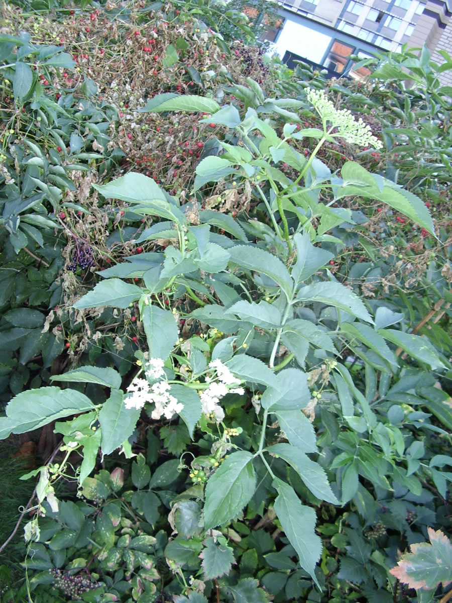 Gistern bün ik in Hamborg merrn in de Binnenstadt ünnerwegens, da lücht wat Witts an'n Wegrand. Un en Duft kümmt vun da, den ik nienich verwesseln kann, denn dat is min Leevlingsduft... Holunner! Holunnerblööt! Un kiek an: da blöht he würklich, blangen de Straat, un dicht bi de blöhen Dolde een mit noch slaten Knubben, un beten dorachter en Dolde mit dunkelblaage Beeren. All dree Stadien vun de Hollerbusch-Dolde blangenanner, hier bi de Sechslingspforte in Hamborg-St. Georg an en Septemberdag! Nu is dat so wiet, nu blöht de Hollerbusch dat ganze Johr. Dat is de "dörteihnte Maand", in den sik alle Köstlichkeiten vun't Johr togliek versammelt! Dat Bild köönt