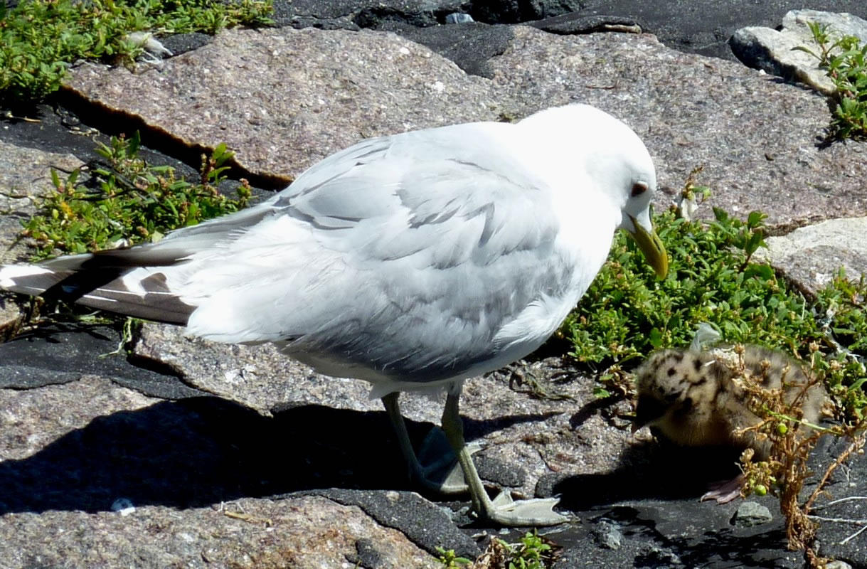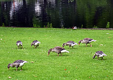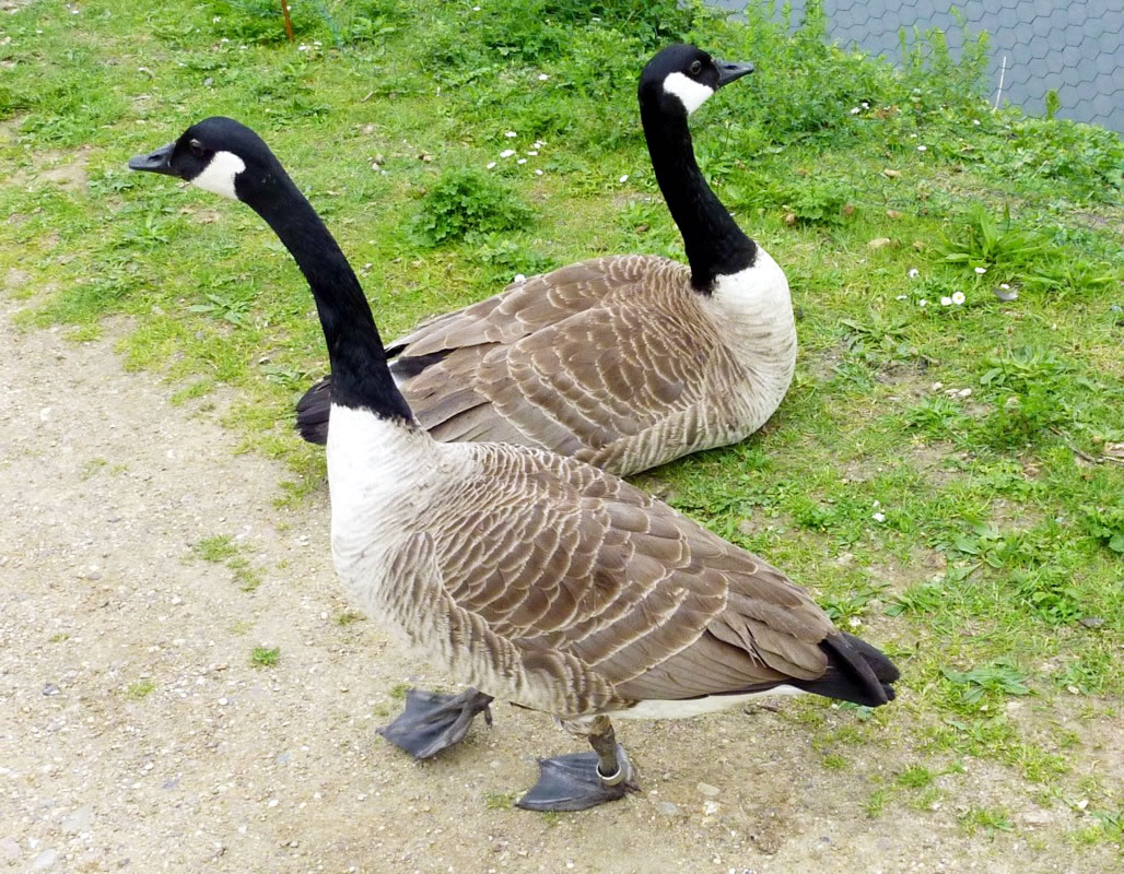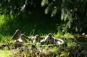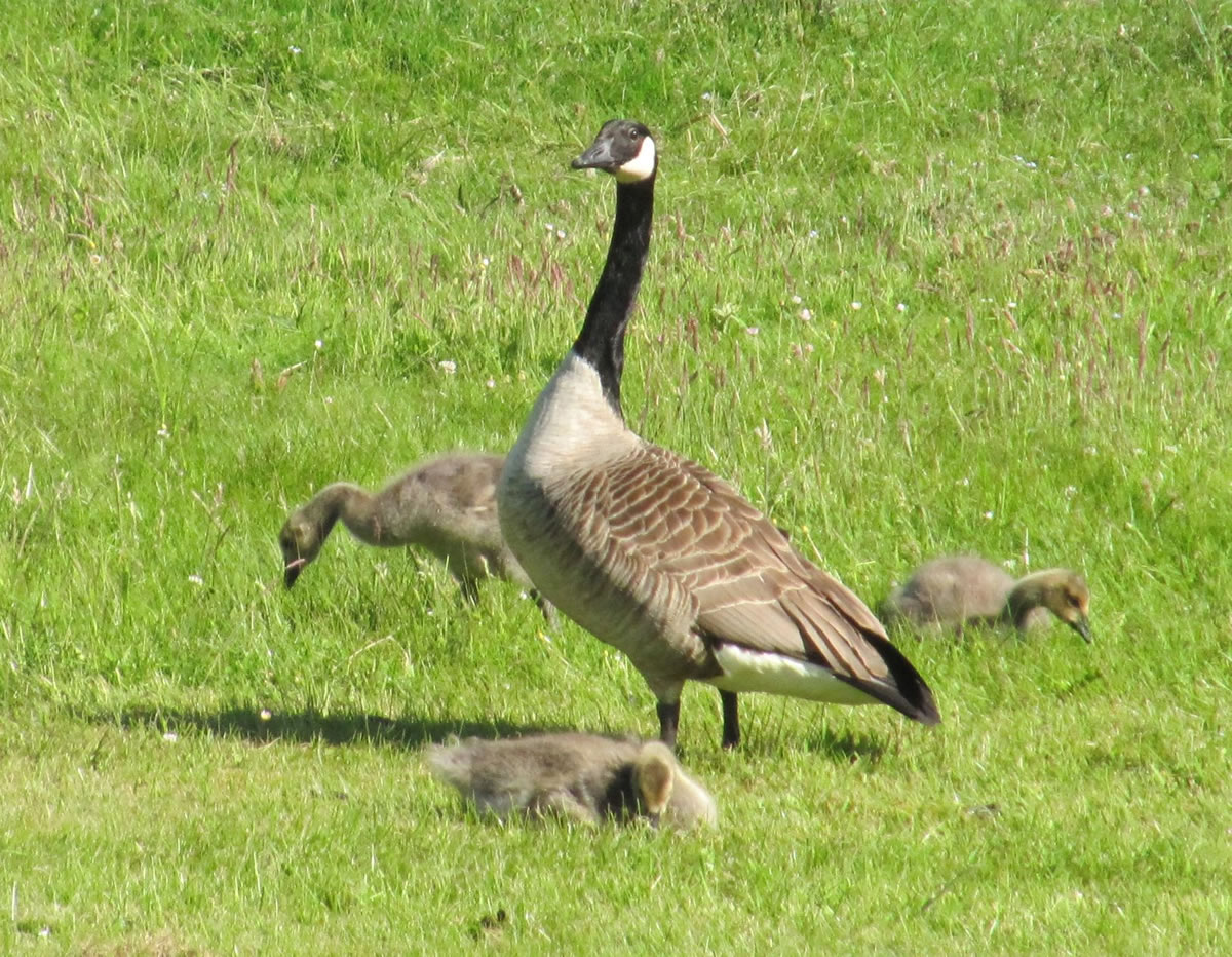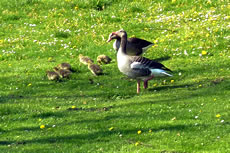 Vadder un Modder passen beide goot up ehr Gössel up. Se leten se nich ut de Ogen. Ik dörf nich to dicht mit mien Knipskassen rankamen. Denn zischen se mi an. Se wiesen ehr Kinner den Weg över de Straat up de grönen Rasen. Dor geev dat frisches Gras. De lütten Gössel un ok de Öllern leten sik dat goot smecken. De Nonnengöös harr ik al mal as Togvagels in Harvst an de Noordsee beluurt. Dor gifft dat regelrecht Nonnengöösdaag. Hunnerte vun Vagels kemen ut den Noorden. De mehrsten flögen wieder. Up de saftigen Wieschen hebbt se sik eerstmal so richtig satt freten. Dor sünd denn wull mal enkelte Vagels hier bi uns bleven. De Biller köönt Se per Klick