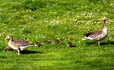 Se sünd wedder dor, de lütten Göös vun verleden Johr. De Öllern harr ik al mal in't Reet sehn. De fief Kinner bün ik hüüt dat eerstmal wies woorn. Kuum dat ik se wedderkenn. Mit luut "Ga, Ga, Ga!" flogen se över mien Kopp un lannen up den Rasen an den Karpendiek. Wat weern dat för smucke Graugöös woorn! De Gröötste keek mi an, as wenn se mi noch kenn. Se snack richtig mit mi. De annern leten sik dat saftig gröne Graas goot smecken. Ganz vörsichtig güng ik wat dichter ran. Aver dat leten se doch nich to. Se böörn ehr Köpp hoch un snacken miteenanner. Denn flogen se all över den Diek. Of de wull hier an den Diek ok mal en Nest buut? De Biller köönt Se per Klick