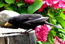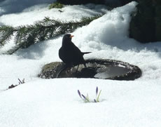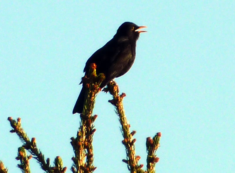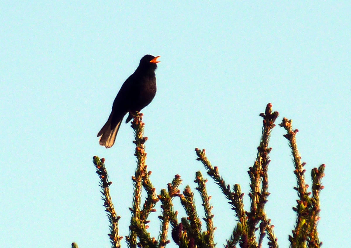 Up dat hüüt bi den stiefen Wind mit dat Avendleed vun de Amsel wat warrd? Ik weet nich so recht. De kann sik ja gor nich up de böberste Spitz vun de Dann hollen! Aver se keem wedder anflagen. Flatter üm den Dannenboom un balanceer up de Spitz. Endlich harr se dat schafft. Krall sik an de Dannennadeln fast un smetter wedder ehr Avendleed. Dat weer en reine Freud. Ut Navers Goorn keem sogoor en Anter. Neegsten Dag harr se dat lichter. De Wind weer inslapen un de Avendsünn warm ehr dat Fedderkleed. De gele Snavel lüüch richtig in de Sünn. Kunnst sehn, dat ehr dat Singen Freud möök. Un so geiht dat jeden Avend. Sülvst Regen kann de Amsel nich dorvun afhollen, uns en Ständchen to bringen. Wi hebbt ehr enen Naam geven. Dat is unsen Caruso! De Biller köönt Se per Klick