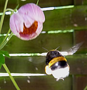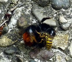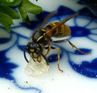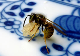 19.8.12 . .Besöök vun en Wöps! Uns Avendbroot et wi in de Sommertiet bi goot Weder ümmer up de Terrass. Aver kuum dat ik den Disch andeckt harr, mell sik al Besöök. Knapp, dat wi up unsen Stohl seten. "Pass up, glieks sünd de Wöpsen wedder dor", meen mien Mann un lang na de Flegenklatsch. "Wie kann't blots angahn? De mütt dat doch rüken." "Nu hau nich glieks wedder na de Wöpsen. Kiek lever to, wie de sik en lütt Stück vun de Wuss halt. De hebbt doch ok Hunger."Aver he leet sik nich begöschen. De Wöpsen summen üm sien Kopp. "Dor sall nu ener ruhig bi blieven!" Aver denn keek he doch to. De en Wöps harr dat besünners up en Stück vun de Sült afsehn. An den Rand vun de Schiev weer en lütt beten Sült affullen. Dor möök se sik överheer. Greep mit ehr Been üm dat lütt Stück un sleep dat över den Töller. Bit an den Töllerrand hett se dat bröcht. Denn flöög se mit dat Stück dorvun. "Kiek mal", meen ik to mien Mann, "de Wöps hett Di doch gor nix daan. Se wull sik blots wat t'on Freten halen." Seker bringt se dat in ehr Wöpsennest. De Biller köönt Se per Klick