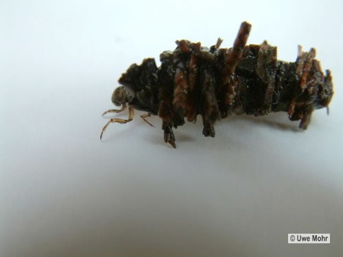 Buten hebbt wi Aprilwedder von Feinsten, dor sit ik leever in't Huus un schrief mool wat över de Köcherfleeg. Op uns Terrasse hebbt wi een lütten Tümpel. Bi't Afkeschern von Loof güng mi een sünnerbores Buwark in't Nett. Ut lütte Holtstücke un afbroken Nodeln von een Zypresse, de an Diek steiht, weer een sonnerbores Huus to sehn, dor kann di de "Lange Anna" von Helgoland infallen. Bloots, an een Enn von düssen Köcher, dor keken dree Been von de Larve rut.