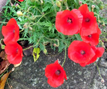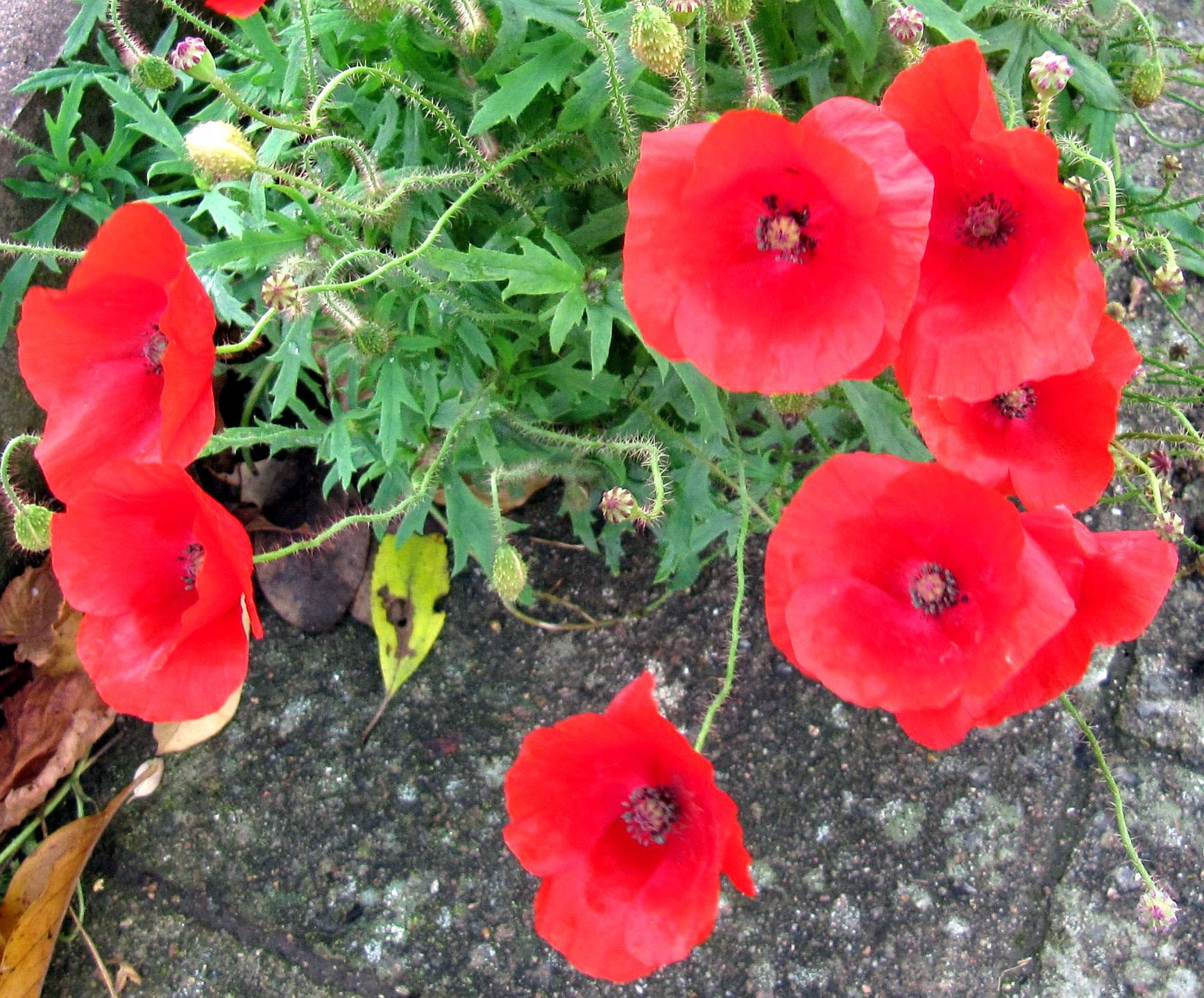 Hupenwies legen rode Bläder up de Straat. Up dat Rasenstück ünner den Boom weer en Bodderbloom kum noch to sehn. Aver sien gele Farv heef sik noch goot vun dat rode Blödenwark af. De lütten witten Mardelbloom keken neeschierig ut dat rode Blattwark. De Storm harr allens verännert. Vörher hebbt wi uns ümmer
