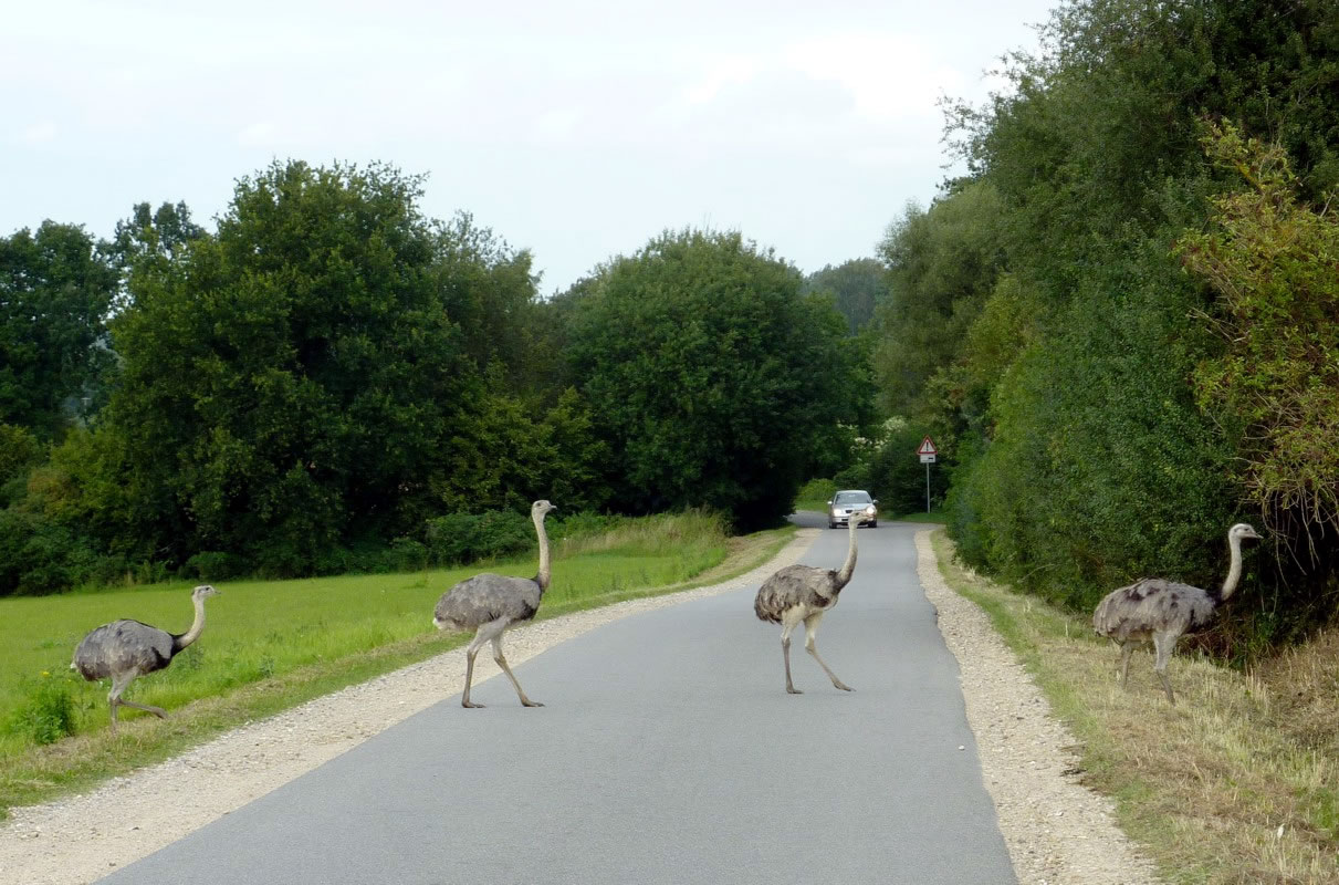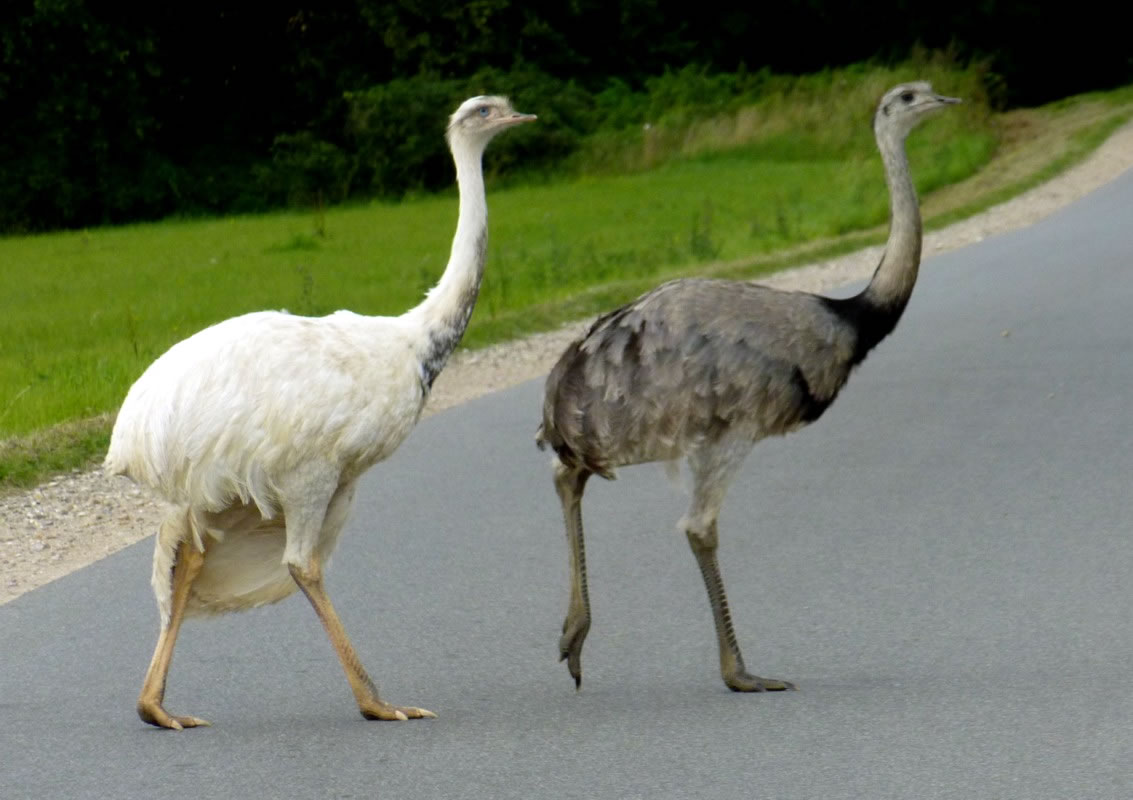 "Pass up!", reep mien Mann, "dor achter löppt wat över de Straat!" Ik weer dat ok al wies woorn. Wi weern in Meckelnborg mit Auto mank Upahl un Schattin ünnerwegens. Vörsichtig föhr ik neger ran. "Du, dat sünd ja Nandus, de över de Straat wüllt", reep ik ut. Un wohrhaftig, een na'n annern keem vun dat linke Feld ümmer neger an de Straat. De eerste sicher na beide Sieden af un marscheer över de Straat. De annern kemen al in "Nandumarsch" achterna. Ik harr intwischen dat Auto an de Stratensiet stellt un weer gau utstegen. Dat müss ik doch knipsen! Nu keem uns noch en Auto mit Licht in de Mööt. Dat stöör de Nandus överhaupt nich. Se marscheern ruhig wieder. Se wullen alle up dat anner Feld.