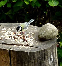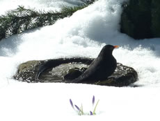 As ik na'n lütt Stunnstiet wedder rut keem, dor bleev ik miteens up'n Stutz stahn. De Vagels harrn miene niege Kumme to'n Badeplatz maakt. Graad tummeln sik dor mehre Blaumeisen in. En lütt Meisje seet mirrn in mien niege Schöttel un sprütt as dull üm sik rüm, denn hüpp se up den Schöttelrand un schüttel sik düchtig ut un denn glieks wedder rin in dat Natt un den Kopp ünnerdükern. Nee, weer dat possierlich! Mien leef Mann harr ja wohl bi't Rasensprengen de Schöttel vull Water "sprengt". Orrer sull dat Afsicht west sien? Up jeden Fall wüß ik nu, woto se bruukt warrt, de Schöttel. Se warrt uns Vageltränke! Veel Freud hebbt wi hatt an dit besünner Geschenk. Wi hebbt tokeken, wenn dat Rotkehlchen baadt hett, orrer de Finken. De Grünlinge kemen glieks mit de hele Familie. Wenn aver de Amsel keem, denn müß ik achteran frisch Water ringeten, so weer de jümmers an't Planschen un Sprütten. Anke Nissen