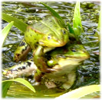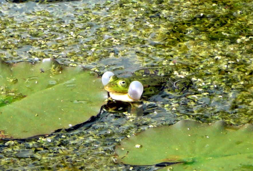 De Wind weer inslapen un de Sünn güng to Roh. De Schummertied harr anfungen. Sogoor de Klock vun Kirchturm weer to höörn, so still weer dat. Se sloog de neegst Stunn an. Quark, quark, quaaark, keem dor en Stimm vun den Diek, de achter unsen Goorn liggt. En tweete Stimm full in. Dat duur nich lang, dor geev dat mit vele Stimmen en richtig Poggenkonzert. Ganz sachte slieker ik mi an den Diek. Dat Quarken wöör luder. De Diek weer ganz mit Seerosenbläder todeckt. Mank de Bläder dükern Poggenköpp up. De witten Swimmblasen heven sik goot vun de grönen Seerosenbläder af. Quark, quark!, keem immer wedder en Poggenstimm. All repen se na en Fru. Een Pogg seet meern up en Seerosenblatt, so as wenn he up den Diek dat Seggen harr. He puss sien Swimmblasen up un quark. Mit enen groten Satz jump he denn in't Water glieks up den Rüüch vun en Fru! De sööch aver dat Wiede. He achteran un wedder jump he up den Rüüch vun de Fru. Nu klammer he sik mit de langen Achterbeen an ehr fass. He leet se nich wedder los. He weer so swoor, dat he se meist ünnert Water düker. En annern Pogg sööch ok en Fru un jump vun Seerosenblatt to Seerosenblatt. Endlich harr he ok en Fru funnen. De ganze Diek weer in Hochtiedsstimmung. Bit laat in de Nacht kunn man dat Quarken vun de Poggen höörn. Dat weer so luut! Oftins stöör dat de Minschen in de Naverschap. Wi aver freut uns ümmer. De Biller köönt Se per Klick