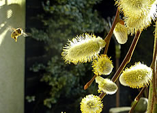 9.3.14 . Märzensünn un Wichelkatten Kuum dat de Märzensünn sik wies un ehr warmen Strahlen up de Eer schickt, zanken sik al de Immen un anner lütte Insekten üm den besten Placken up mien Wiedenstock. Ik harr en lütten Wiedenstock schenkt kregen un up den Terassendisch stellt. Eerst summen de Insekten üm de Narzissen up de Finsterbank. Se zanken sik richtig üm en Blööt. Denn flögen se na den Wiedenstock up den Disch. De stünn dor eerst en gode Stünn. Dat weer en Gesumm un Gebrumm up de Terrass! De lütten Deerten weern wull meist al to glieken Tiet ut den Winterslaap upwaakt. Un nu harrn se Hunger. De gelen Wiedenblöden harrn se al düchtig dörcheenanner bröcht. De weern al richtig strubbelig. Nu misch sik noch en ganz depen Ton mank dat Gebrumm. En Eerdhummelkönigin weer ok waak woorn. Se geev den Ton an un sett sik meern mank de gelen Blöden. Dat weer en richtig Fröhjohrskunzert up de Terrass. De Biller köönt Se per Klick