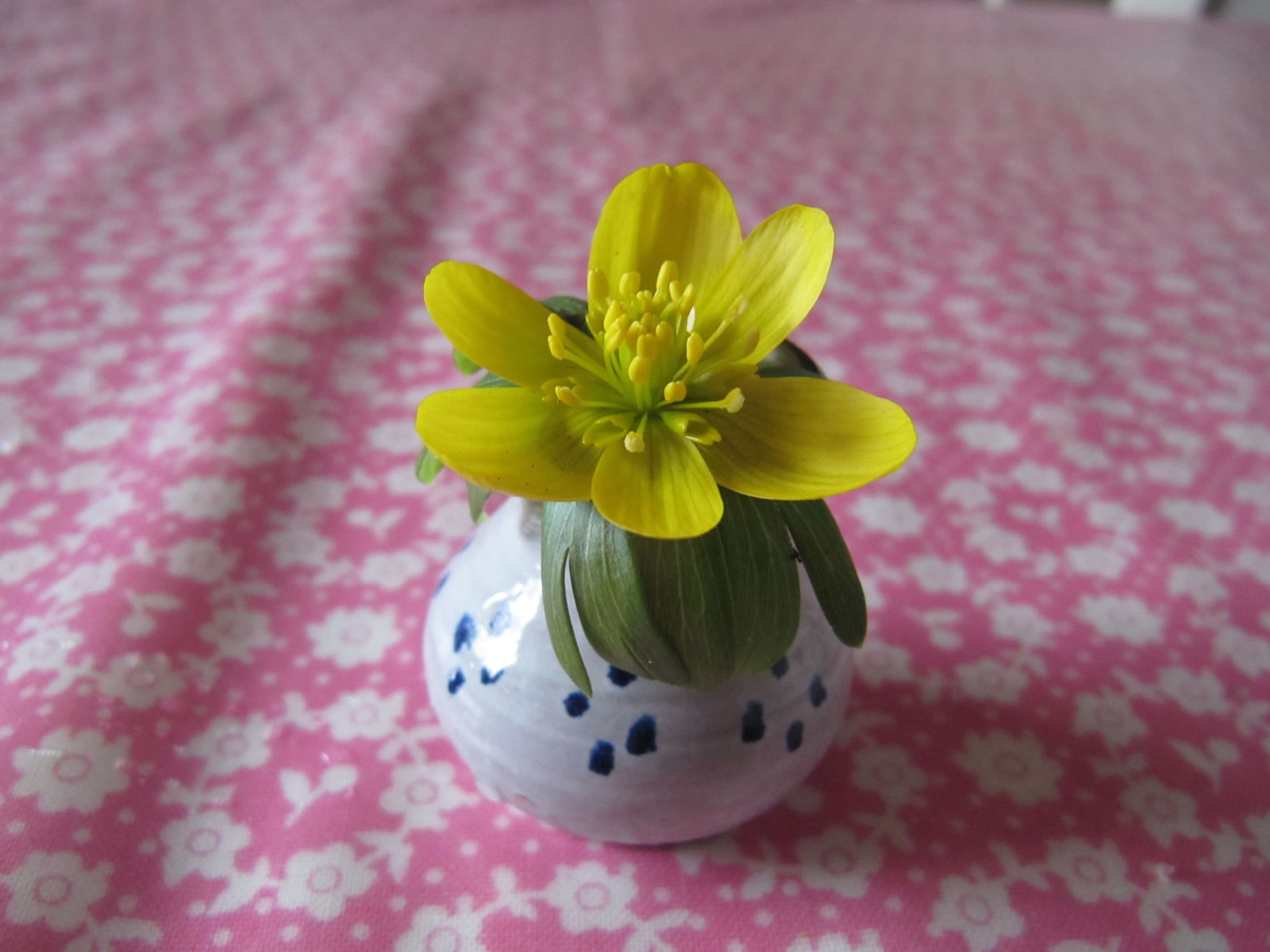 Toonputt up den Terrassendisch. De De Kohbloom tellt to de Hahnenfootplanten. Fief grote gele Blödenbläder