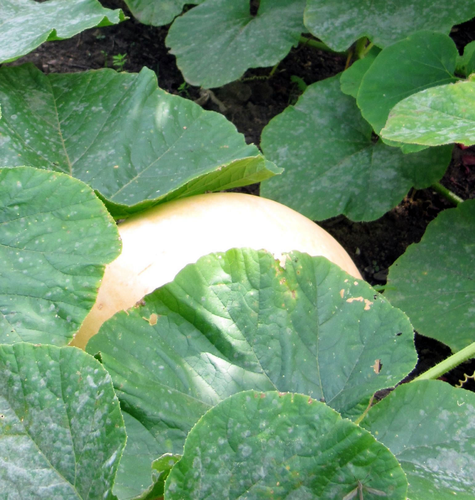 Kürbis ran. He liggt komodig mank Kürbisranken un Kürbisbläder