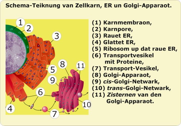 Dei Zellen van dei högeren Organismen, dei Eukaryonten, schäd sick van ehre einfacher upbawden Prokaryonten-Vedders in ein poor wichtige Deile. Wiss sünd dei komplexer. Ehr dütlicket Unnerdeilen in Kompartimente dör Membraonen affschlaoten Affdeile as den Zellkarn off dei Mitochondrien sünd afftrennte un unaffhängige Reaktionsrüme, in dei parallel unnerscheidlicke Speziaolprozesse väl bäter kontolleiert affwickelt werd, as dat in einen grötteren Pott passeiern kunn, in den aale för aale Reaktionen nödige Utgangsstoffe unsorteiert, gaut mischket dörnanner suuset. Aower kien Vör- aohne Naodeil: Dei speziellen Reaktionsrüme mäötet mit Verlaot blots mit dei för ehr vörseihn Speziaolmoleküle versorget wern. Zellen bruket dormit ein utklamüstert Logistiksystem, dat so tüschken dei Tauläwer-Affdeile un dei Endmontaogehalle warket un tauleßte uck dorför sorget, dat ein fardiget Endprodukt ein Hormon off ein Neurotransmitter ut dei Zelle utföhrt werd, jüst dann, wenn et butsiet anföddert werd.