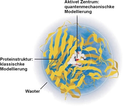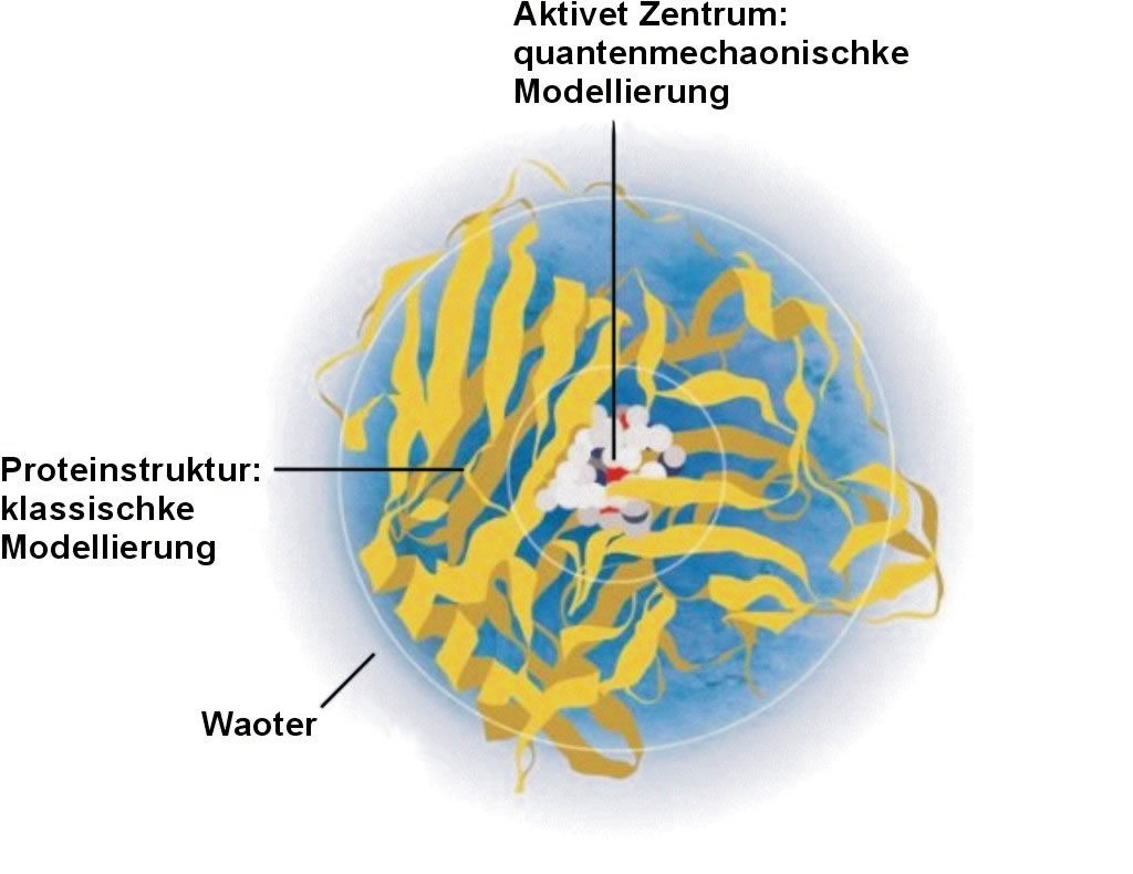 In Wohrheit deit man dat aower nich. Nämlick dorbi verbrukt dei Quantenmechaonik för Molekülsimulationen so väl Räkenkraft, dat et nich angeiht, dat man dei aktuellen Computer ein koplettet Protein up disse Ort dörräken lätt. Reaktionen tüschken lüttke orgaonischke Moleküle kunn man mit disse Methoden eintied bewarken man jüst bi dei Biochemie mit ehre groote Bandbredde an Reaktionen, Produkte un Katalysatoren haren dei Computermodellierer schiens för immer kiene Chance. Dei Lösung van dat Problem lutt achternao recht einfach un ligg dune bi: Man arbeitet up dei verschiedenen Gröttenskaolen mit unnerscheidlicke Methoden. Dat komplette Molekül butenümmetau kann man mit dei klassischken Physik un so mit minne Räkenupwand beschriewen. Un in dat aktive Zentrum, wo sick dei eigentlicke Reaktion affspält, settet man dei dynaomischke Quantensimulation in. Dei eiersten Aktionen in disse Richtung mök man nich an komplexe Biomoleküle, sünners an dorgägen orig einfache aromatischke un unsatte Kohlenwaoterstoffe, woan Karplus un Warshel in dei 1970er Johre warkden. Don versöchden sei, dei Schwingungs- un Elektronenspektren van disse Moleküle tau simuleiern. Dortau brukden sei eiers eis dei Bindungslängten un -winkels in't Molekül, dei sei mit dei klassischken Kraftfeldmethoden bestimmden. Hybride Molekülmodelle Baobenskoop kaomt in disse Stoffe aower uck dei Elektronen van dei Dubbelbindungen vör, dei sick frei äöwer groote Rüme bewägen käönt un dei ehre naue quantenmechaonischke Eigenschkup ein Bedüden häbbet för dei vörutseihn Absorptionsspektren. Disse soneumten konjugeierten Elektronen modelleierden Karplus un Warshel mit quantenmechaonischke Methoden. Disse hybride Ansatz bröchde den Erfolg, un dat, wo doch dei Forschkers twei heel verschiedene physikaolischke Modelle tausaomeknüppden. In disse freuhe Arbeit funktionierde dat uck dorümme, wiel dei unnersöchten Moleküle plaon un stief sünd. Dat "klassischke" un dat "quantenmechaonischke" Elektronensystem sünd up disse Ort all rüümlick updeilt un dei doch so unnerscheidlicken Methoden kriegt sick nich in dei Klatten. All ein poor Johre Läöter brobeierde Warshel ut, ditmaol tausaome mit Levitt, off man disse besünnern Raohmenbedingungen woll weglaoten kunn. Dortao nöhmen disse Forschers einkomplexet Biololekül: Dat Lysozym, ein Enzym, dat Zuckerkäen upkielt. Dormit man disse Raktion Simuleiern kann, mutt man blots dei würklich bi dat Upkielen mitmaoken Strukturen quantenmechaonischk behanneln dei groote Rest van dat Enzym werd wiederhen klassischk modelleiert. Grenzverkehr tüschken Quanten-Land un Klassik-Land Hier sünd aower beide Deile pass miteinner verknüppet und bewarket sick gägensietig. Dei Upgaobe hiertau hätt wat tau daun mit ein Problem ut dei Wirtschkup: Wo organiseiert man den Hannel tüschken twei Länder mit unnerscheidlicke Währungen? Man mutt ein System finnen, dat man an dei Grenze eine Währung mit Verlaot un mit bekannte Kurse gägenenanner ümmetuschken kann; dei Währung, mit dei Atome un Moleküle hannelt, is Energie. Aohne up dei grundsätzlicken Unnerscheide tüschken dei Methoden tau achten, fünnen Levitt un Warshel Verfohren, den Transfer van Energie äöwer dei Grenzen weg tüschken dat "Klassik-Land" un dat "Quanten-Land" pass tau beschriewen, uck för dat Wesselwark tüschken Moleküldeile ut beide Regionen. Dör dissen Erfolg kunn man grundsätzlick, in den Raohmen van ein klassischket Molekülmodell, dynaomischke Reaktionen quantenchemischk beräken. Sietdem bruket man in dei Chemie faoken disse Möglichkeit.