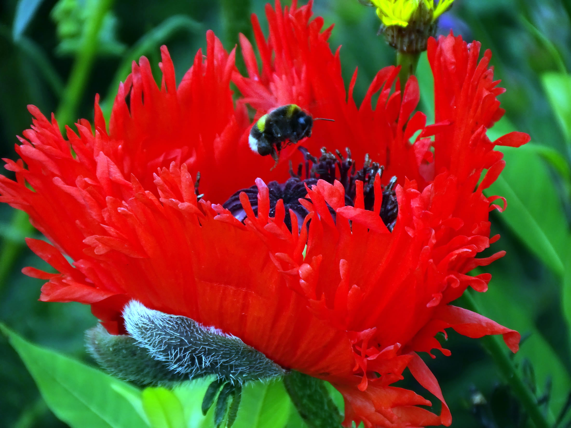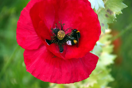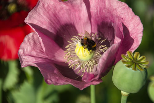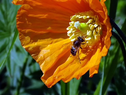 För de Insektenwelt beedt de Mahn mit sien wied apen Kelche en koles Büffet vun Extraklass. Nektar is nich dorbi, avers en heel weertvulle Pollen. Jedeen Mahnblööt hett 2,5 Millioonen Pollenkörner, de vun Immen, Hummeln un meist all anner Insekten geern nahmen warrt. Sünnerlich de Hummeln gaht al fröh an'n Dag heftig in de Blöden tokehr. Mehrst warrt so en Mahnblööt al an een warmen Vörmittag heel un deel utplünnert wat ehr ganz recht is, dorför is se ja dor, all ehr bunte Klöör schall ja bloots de Insekten antrecken; un nameddags welkt se gau. In dat Bild nerrn sünd en Sweevfleeg un baven op dat Blatt en lierlütte Fleeg un en mikroskoopsch lütte Spinn op den Mahn togang. In dat Bild dorünner besöcht en lütte Grill de Plant. Een Wildimmenaart hett ehrn Naam vun den Mahn: de Mahn-Muurimm. Se bruukt vun den Mahn nich bloots sien Pollen, sünnern ok de Bläder för ehr Brood-Röhr. Düsse Imm steiht wied baven op de Rode List un warrt sachs nich mehr lang bi uns leven, wenn dat mit de industrielle Landweerschap so wiedergeiht. tosamenföögt verfluttert un doch so deep in 13.6.2020