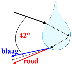 6. Okay, ik geev dat to. 42° is bloots de Middelweert. Dat blage un vigelette Licht warrt stärker braken, noch mehr op den uursprünglichen Strahl to. Dat rode Licht nich so stark. Dortwüschen finnt all de annern Farven statt geel, gröön, orange. De Regenbagen! De Spektraalfarven kennt wi dorüm ok as de Regenbagenfarven. Wi seht den Regenbagen also in en Winkel vun 42° üm de uursprüngliche Richt vun't Sünnlicht. Dat verklaart al mal, woso nich de ganze Heven bunt is. Dat blaage un vigelette Licht is dorbi binnen, dat rode buten.