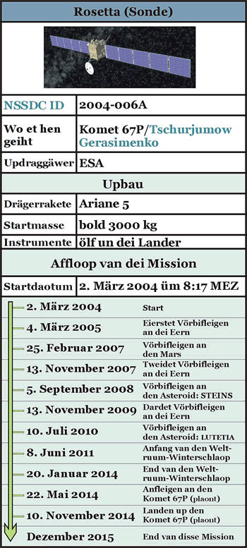 Dei Mission An Bord van Rosetta is uck dei 100 kg schwore Landeapparaot (= Lander) Philae. Dei schall up den Komet landen un Experimente maoken, dei Wiesteiken gäwet äöwer den Upbau van den Komet. Dei Daoten gaoht an dei Rosettasonde, dei up eine Ümloopbaohn üm den Komet bliff, un werd denn an dei Eern wiederleitet. Solange man nich naug äöwer den Upbau van den Komet weit, werd Rosetta vör dat Affsetten van Philae eiers maol dei Butensiete kartograopheiern un analyseiern. So will man eine passen Landestä finnen, uck wenn man vörweg nich naug Künne doräöwer hätt. Ansick was dei Start van Rosetta all för den 13. Januar 2003 plaont un dei Landestä schull up den Komet 46P/Wirtanen wän. Dat Ariane-5-Raketenprogramm mök Probleme, so wörd dei Start üm ein Johr verschaoben. Uck den nächsten Start an den 26. Februar 2004 möß man wägen leipet Weer 20 Minuten vör dat Affhäben affbräken. Wägen den starken Wind in dei bäöweren Atmospäre wörd disse Termin up den 27. Februar 2004 verleggt. Man an dissen Dag fünd man einen Fähler an den Hitteschutz un dei Start wörd up Anfang März verschaoben. Eiers fief Daoge läöter was denn dei Start van Rosetta an'n 2. März 2004 van dat Weltruumzentrum Kourou in Französischk-Guayana. Dei Drägerrakete van den Typ Ariane 5 G+ steeg up üm 8:17 Uhr MEZ mit dei drei Tonnen schwore Sonde an Bord. Dei Sonden-Naome Rosetta kummp van den Stein Rosetta, womit man den Code för dei ägyptischken Hieroglyphen in dei Hand har. Up dei süftige Ort schall dei Sonde Rosetta dorbi helpen, Künne tau kriegen äöwer den Taustand van dat Sünnensystem as dit entstünd. Dei Naome van den Lander Philae kummp van eine Nil-Insel, up dei man einen Obelisk fünnt, dei bi dat Entziffern van den Stein Rosetta hülp. An Bord van Philae is ein Prototyp van dei so neumte Rosetta Disk, eine bold fief zentimeter groote Schiewe ut eine Nickellegierung. Up dei sünd so üm dei 15000 Textsieten mit Informationen äöwer 2500 Spraoken mikroskopischk lüttket inätzet.