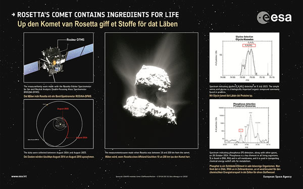 In dei Massenspektren baoven werd dei Stücktaohl van dei up den Detektor ankaomen ioniseierten Deilkes as eine Funktion van dei Laoge up den Detektor wieset, as ein Masse/Laodung-Verhollen (m/z). Man funnt Glycin (C2H5NO2) mit 75 Dalton (afkortet Da), Methylamin (CH5N) mit 31 Da un Ethylamin (C2H7N) mit 45 Da. Dei Köppel van dat Molekül-Ion CH4N+ is dei gröttste, un et entstaiht bi dei Stöt-Ionisation van Glycin mit dei Masse 30 Dalton (Da). Et kann aower uck ut dei beiden annern Amine affstammen. Aale Molekül-Ionen werd dör dei Naober-Massenpeaks van dei tauhören Stamm-Moleküle affscheert. As Bispill finnt wi C3H7O2+ mit dei Masse 75 Dalton pro Elektronenlaodung (Da/e). Dat is woll ein Restmolekül van Propylenglycol (C3H8O2), off van ein Isomer, off sogar van schwörere Moleküle, so as van Butandiol (C4H10O2). Mehr äöwer dei Daten-Anaolyse för Rosina DFMS finnt man in eine Studie van Le Roy et al. Väle Biller krieget wi opstunns van den 67P-Komet "Tschuri". Van dei heele Rosetta-Mission hätt dei ESA tau'n Johreswessel dei Biller for den allgemeinen Bruuk freigäben (süh ESA-Bildarchiev un süh ESA-Biller, aktuell). Dei Rosetta-Sonde sendet jeden Dag neie Biller. Dat löpp noch bit tau'n September 2016. Denn schall Rosetta sülwes up den Komet 67P landen.