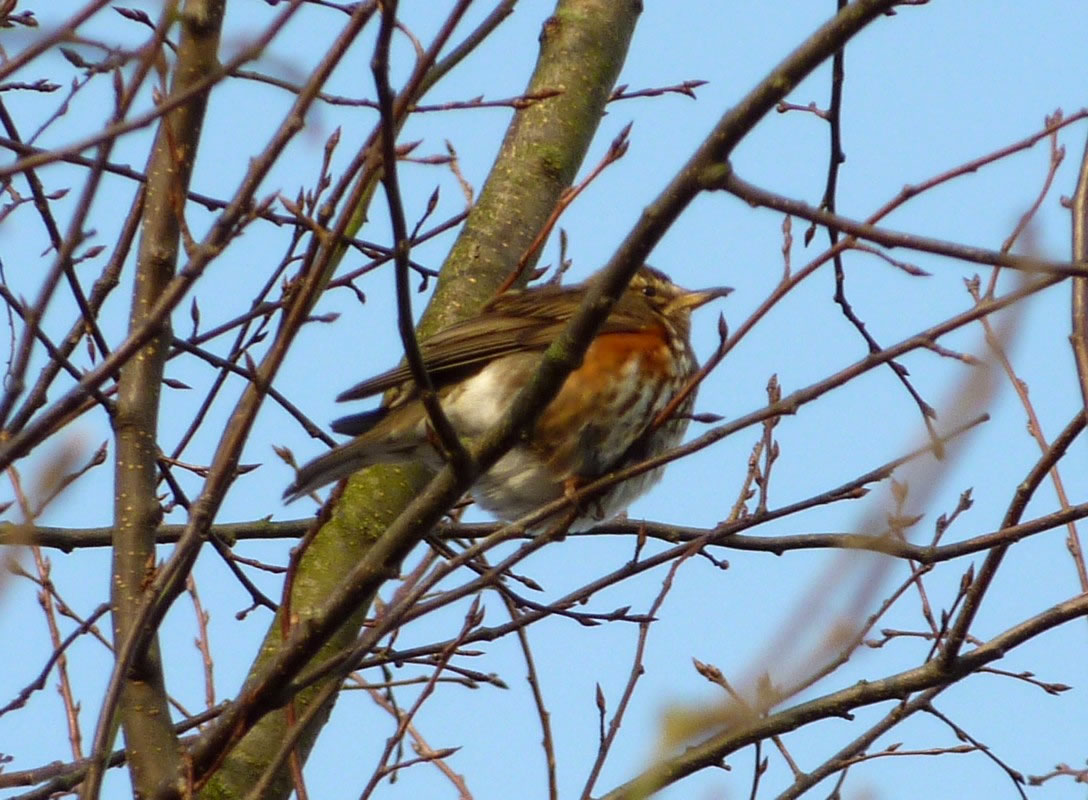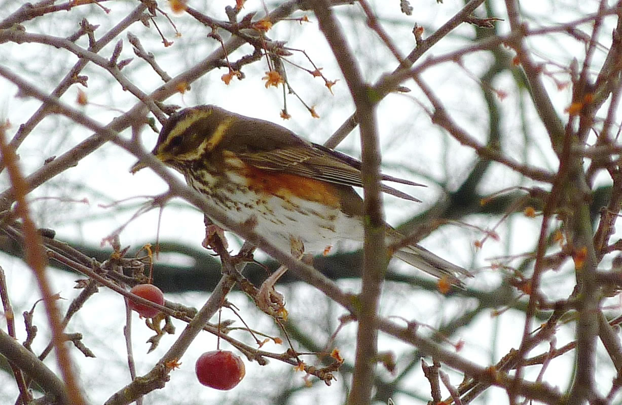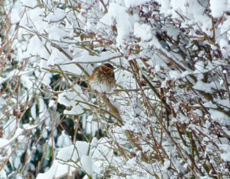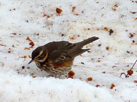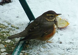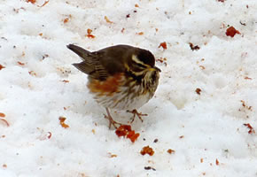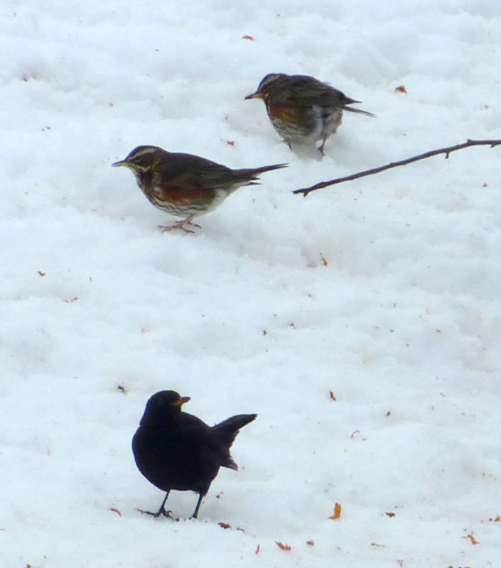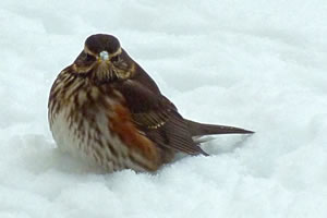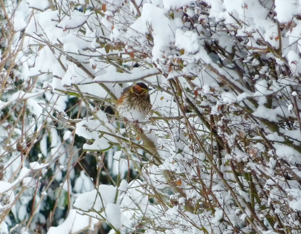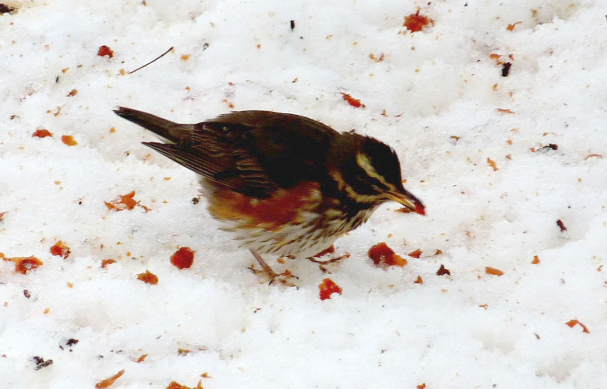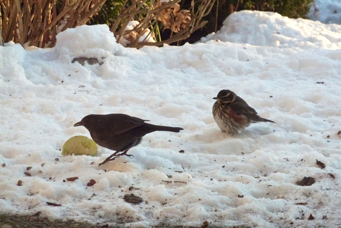 Ganz bescheiden seet he an de Siet un tööv, dat he ok en Stück Appel afkreeg. Aver dat leten de swatten Amseln nich to. Se hebbt den frömden Vagel verjaagt. In de Nacht harr dat wedder düchtig sniet. De frömde Vagel weer al ganz fröh wedder dor. Dat weer en Rootdrossel. Düttmaal seet se in de mit Snee toweihte Heck. Se harr Glück. Dor weer blots een Amsel up de Terrass. De hett de Rootdrossel an en Appelstück ranlaten. De Rootdrossel is hier bi uns nich to Huus. Blots wenn dat enen strengen Winter gifft, kümmt se in uns Gegend. Se is för uns en Wintergast.