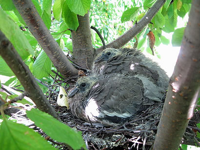 Denn sünd an een Dag mit eenmaal söven oder miehr Heisters mit ehr Schäckern tosamen. Denn avers war dat musingstill. De Heister, de de Duven jümmer tarrt hett, maakt dat wedder. Kann sien, dat de Düffer achter den swatt-witten Vagel achterranjachtert. Nu susen all de annern Heisters in den Boom mit dat Nest un maken en Mordskrach. De Düffer un de Duuv weiten, dat se ehr Kinner nich miehr helpen köönt. Se fleigen weg un kieken vun Wieden tau, wo ehr Bruut ümbröcht ward. De Heisters bringen de lütten Duven üm un freten sik satt. Wenn se dormit trecht sünd, lööst sik de Schwarm up un elkeen Heisterpoor flüggt trüüch in sien Rebett.