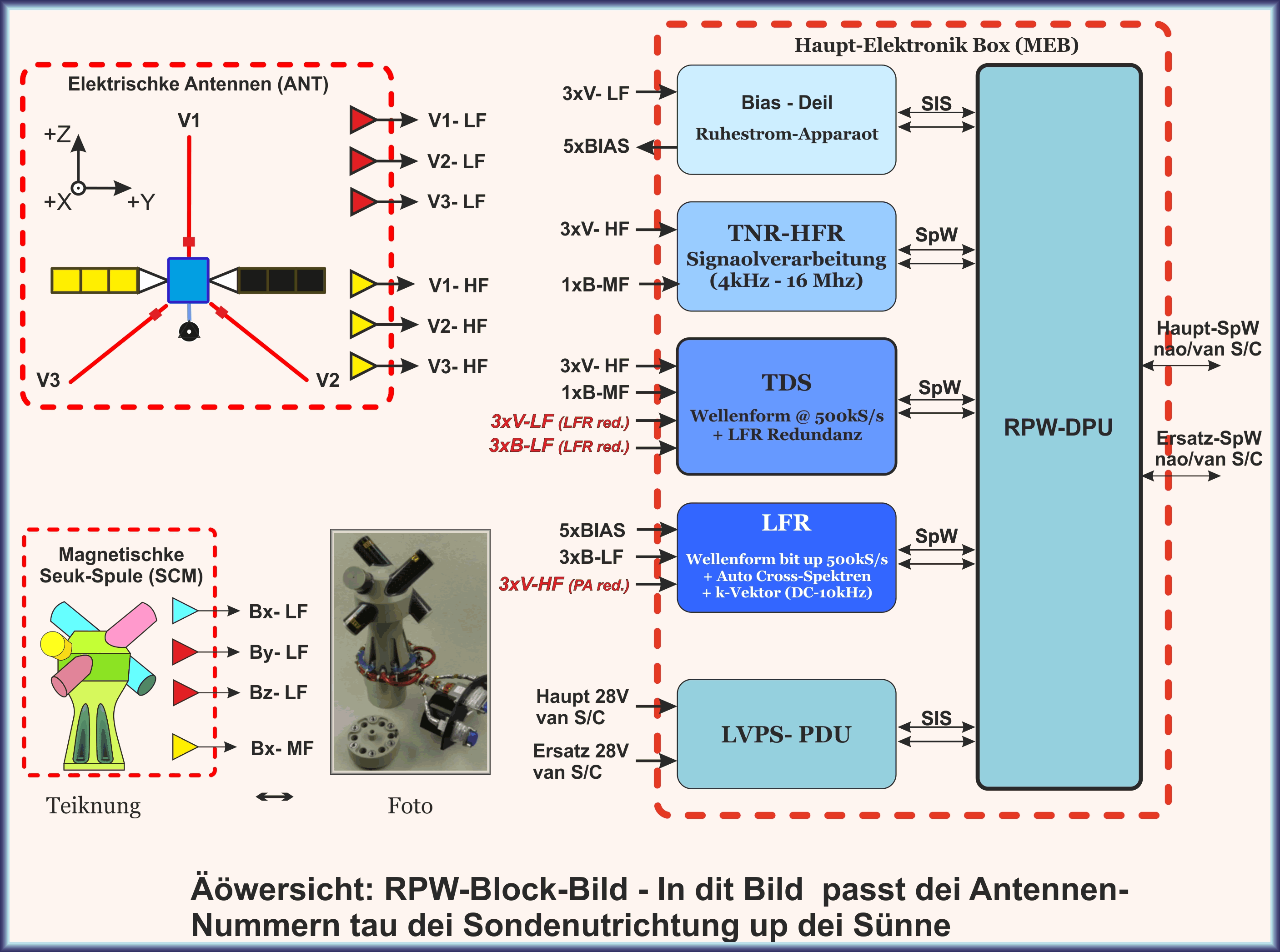 Dei thermischke Ruusen- un Hochfrequenzempfänger TNR-HFR Dit System faotet dat ümgäben Elektronenvolk dör dat Mäten van dat lokaole Ruusen bi dei Plasmafrequenz un giff Künne äöwer dei Sünnen-Radio-Emissionen wieder weg. Dortau läwert TNR-HFR bi ein verschiedenet Tied-Uplösen elektrischke Leistungsspektren van 4 kHz un magnetischke Leistungs-Spektral-Dichten van 4 kHz bit 500 kHz. Dat BIAS läwert einen konstanten Strom an dei elektrischken Antennen. So kann dit System naue elektrischke DC/LF-Feld- un Satelliten-Potential-Daoten faoten, wobi dei Impedanz in dei Plasma-Kopplung verminnert werd. Dat SCM is ein induktiven Magnetsensor, dei ut einen Karn van ein Hochpermeabilitäts-Materiaol (Ferrit off Permalloy) bestaiht. Dorümme werd einige Duusend Windungen un eine Sekundärspule mit ein poor Windungen wickelt. Dei SCM sitt an den langen Instrument-Arm. Disse Unnersysteme häbbt tausaome eine DPU, dei Befähle,