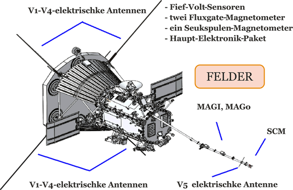 Fields (Felder mäten) Bild-Daoten: Nasa, affännert Dei Instrumenten-Satz Fields faotet dei Grötte un dei Form van elektrischke un magnetischke Felder in dei Sünnen-Atmosphäre. Fields mätt Wellen un Turbulenzen in dei Binnen-Heliosphäre mit ein hoget Tied-Uplösen. So kann man Künne kriegen äöwer dei Felder, dei verbunnen sünd mit Wellen, Tausaomestöten un magnetischke Trügge-Bindung, dat is ein Prozess, wobi sick dei Magnetfeldlinien mit eine Explosion nei utrichtet. Mit dit Experiment kann man direkte Daoten faoten van elektischke Felder un Wellen, van dat Poynting-Fleiten, van dei afsolute Plasmadichte un van dei Elektronentemperatur, van dat Schwäwpotentiaol- un Dichteschwankungen van Ruumfohrtüge un van dei Radioemissionen. Dat Poynting-Fleiten is ein elektromagnetischket Energiefleiten, dat dör Magnetfelder andräben werd. Dei Astrophysiker beräket in dei Theorie ein Poynting-Fleiten, so käönt sei dei Plasmaphysik van verschiedene Objekte verstaohn. Fields mätt dat elektischke Feld üm dat Ruumschipp herümme mit fief Antennen, veier dorvan staoht äöwer dat Sonden-Hitteschild weg in dat Sünnenlecht. Dor stigg dei Temperatur up 1371 °C. Dei twei Meter langen Antennen ut eine Niob-Legierung käönt sücke weusten Temperaturen aower uthollen. Fields mätt elektrischke Felder in einen breien Frequenz-Ümfang, direkt an'n Oort un uck van wieder weg. Dei veier Antennen in dat Sünnenlecht mätet up twei Oorten dei Eigenschkupen van den drocken un van den langsaomen Sünnenwind. Dei fiefte Antenne, dei in den Schadden van dat Hitteschild in einen 90°-Winkel tau dei annern van dei Sonde affstaiht, helpet bi dat Dorstellen van ein dreidimensionaolet Bild van dat elektrischke Feld bi högere Frequenzen. Ein Dreier-Magnetometer-Satz, jedet bold so grot at eine Fuust, helpet Fields bi dat Faoten van dat Magnetfeld. Ein Seukspulen-Magnetometer (SCM) mätt, wie sick dat Magnetfeld mit Affloop van eine wisse Tied ännert. Wessel-Magnetfelder induzeiert eine Spannung in dei Spule. So kann man an dei wesseln Spannung seihn, wie sick dat Magnetfeld ännert. Twei glieke Fluxgate-Magnetometer, MAGi un MAGo, mätet dat grote koronaole Magnetfeld. Dei Fluxgate-Magnetometer käönt dat van dei Sünne wieder affliggen Magnetfeld, dat sick langsaom ännert, utmäten. Dat Seukspulen-Magnetometer mätt aower duuner an dei Sünne, wo sick dat Feld drocke ännert. Et faotet dorümme dat Magnetfeld mit eine Geschwinnigkeit van twei Millionen Maol in eine Sekunne. Süh hier dit Video: Felder