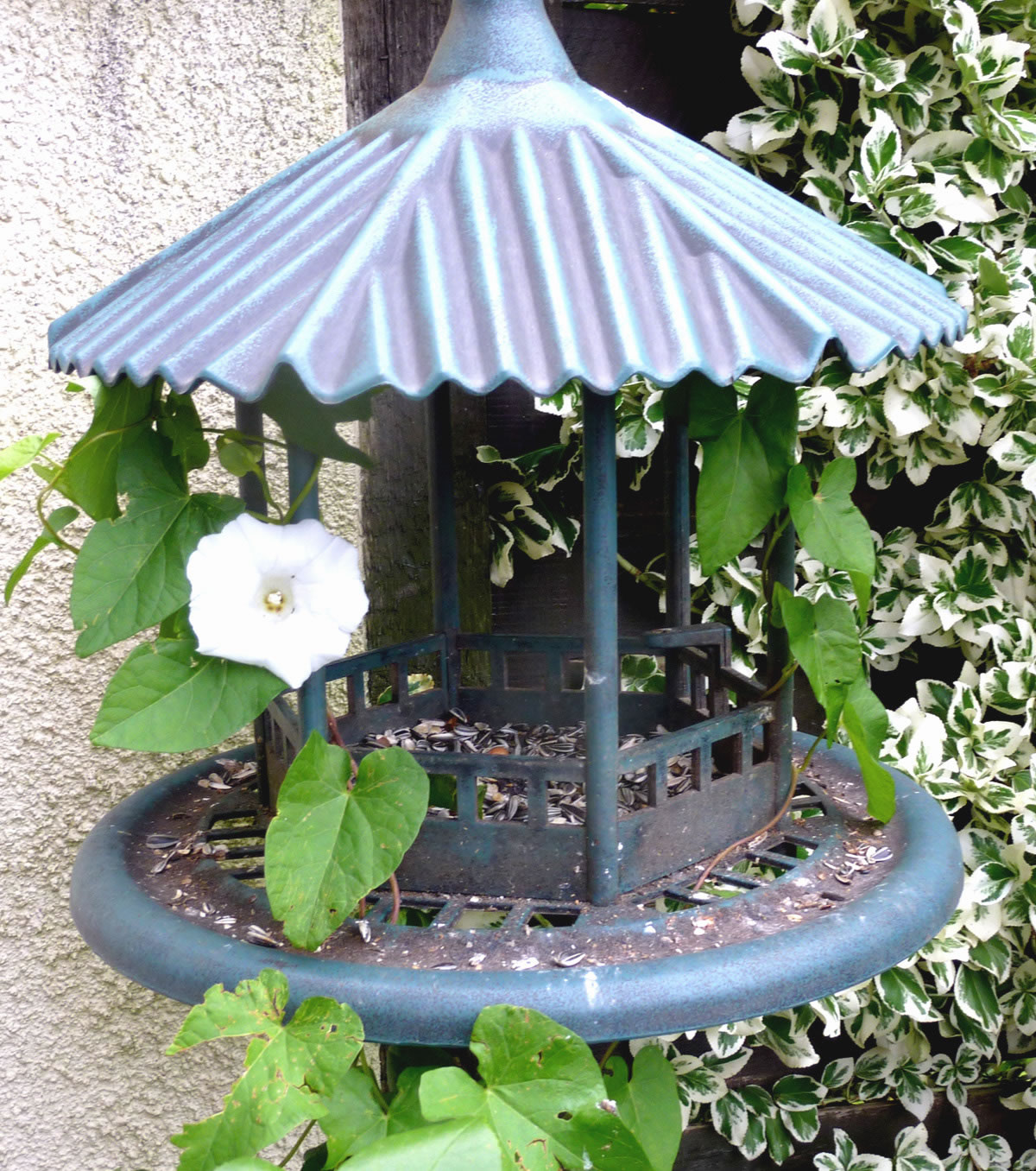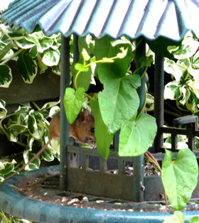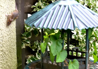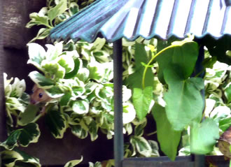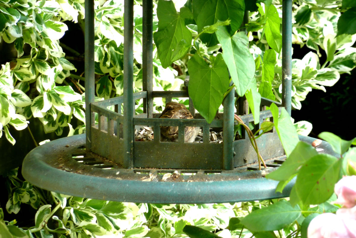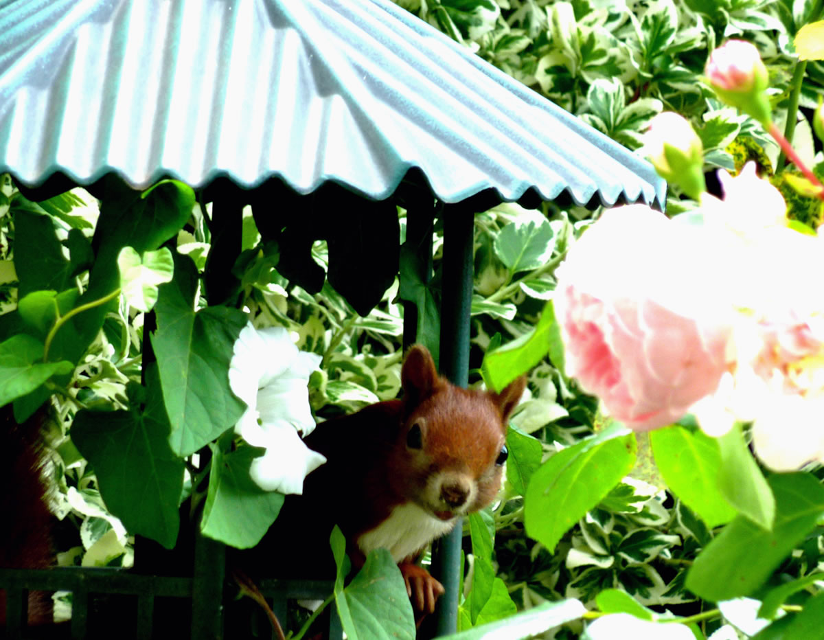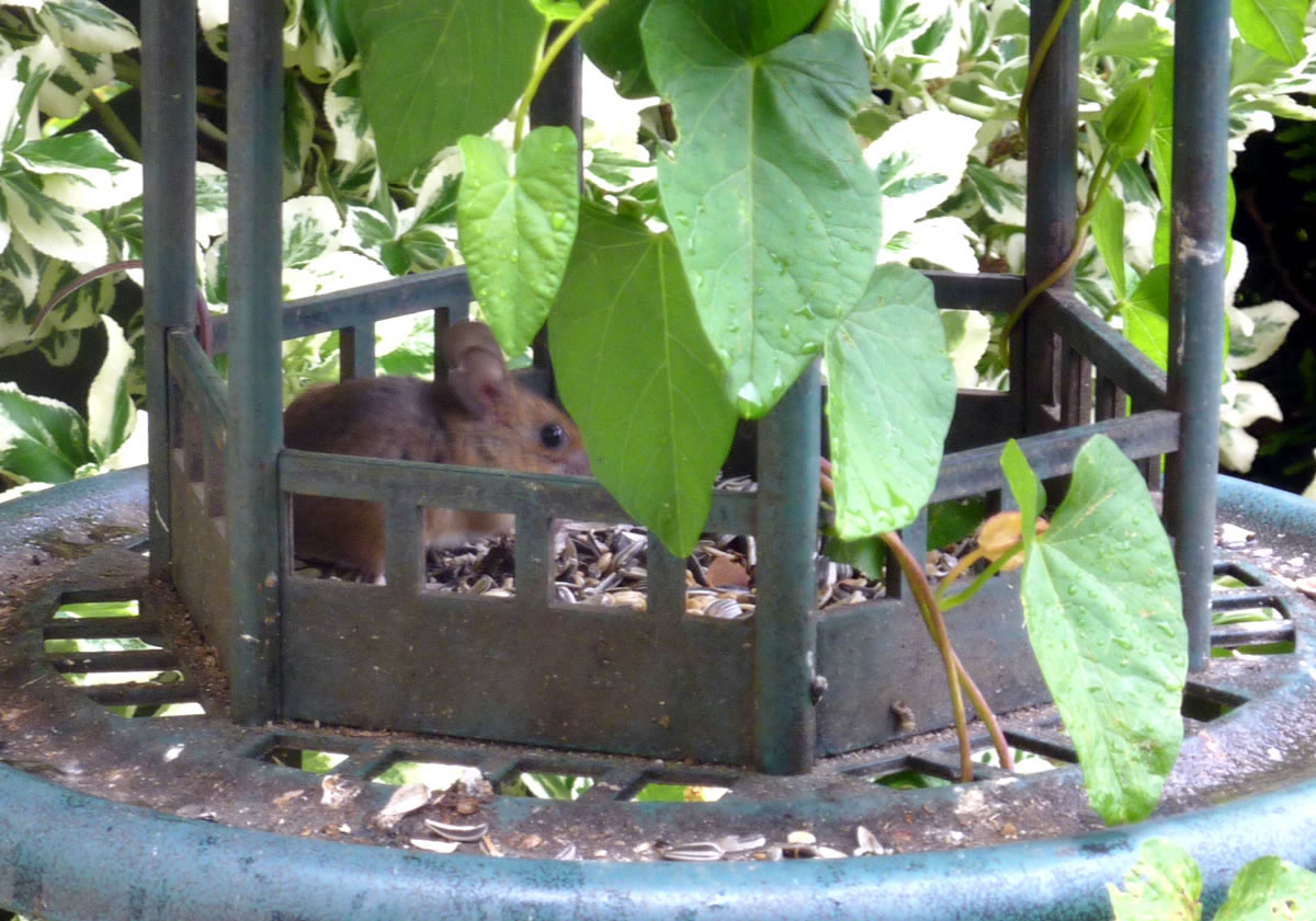 Musenstill seten wi nu up uns Stöhl un töven up den neegsten Besöök vun de Muus. Dat duur natüürlich en ganzen Stoot. Aver denn beweg sik dat Loov an de Lattenwand un de lütte Kopp mit de swatten Knoppogen vun den Spitzboven kemen to'n Vörschien. Denn hangel sik de Muus an de steile Terrassenwand na ünnen. Mit enen riesigen Satz sprung se över den Afgrund up dat Gitter vun de Vagelampel. De schaukel richtig hin un her. Denn leet de Muus sik dat goot smecken.