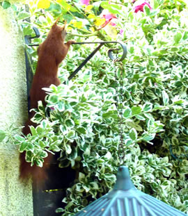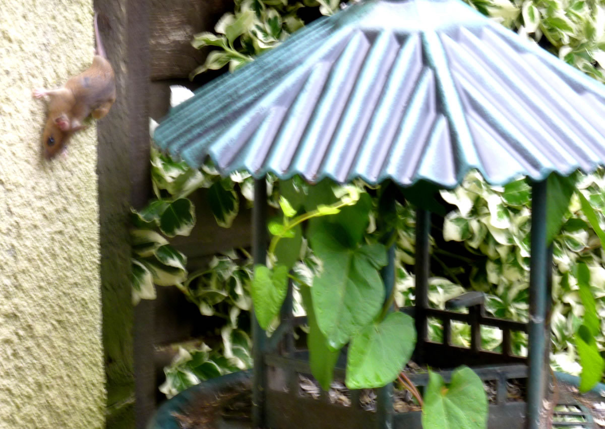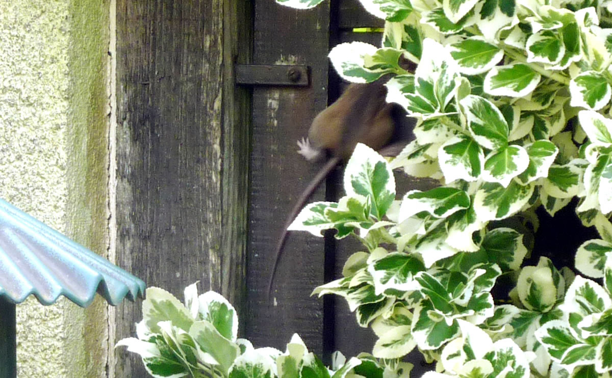 So'n Akrobatenkunststück harrn wi bit dorhin blots mit Jan Flink den Katteker beleevt. De kladder achterna ümmer över de Lattenwand un leep dorvun. Nu harrn wi enen tweeten Spitzboov. Keen Wunner, wenn dat Foder ümmer so gau all weer! De lütt Muus leep achterna noch över de Terrass. Dor kunnen wi den lütten Spitzboven genau bekieken. "Du, dat is aver glööv ik en gewöhnlich Huusmuus. Wi mööt de Terrassendöör tohollen!", meen mien Mann. "Sünst hebbt wi in'n Winter Müüs in't Huus!" 13.7.2014