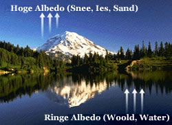 De Torüchstrahl-Kraft von een Saak warrt vun de Wetenschaplers "Albedo" nöömt. De frischfoolen Snee strahlt 85-90 Perzent von dat Sünnlicht wedder torüch! He hett also een hoge Albedo. Altosaam smitt de ganze Eer bi 31% Strahlung torüch. De Woold süht in de helle Sünn dorgegen heel swatt ut. De nimmt binah all de veelen Strahlen op. Dor warrt dat denn ok richtig scheun warm an'n Holt. To'n Glück riekt de Sünn in so'n Woold nich so richtig rünner na'n Bodden. Sünst weer dat velicht to veel. De witte Sand an'ne Küst reflekteert man ok bloots bi 35 Perzent. Dat heff ik nich dacht! De blend't doch ok so as Snee. Dat kann een sik licht vörstelln, dat de Albedo ok wichtig dorför is, dat dat op de Eer nich to hitt warrt, nich? De Woolden hebbt twoors en ringe Albedo, avers se benütt de Strahlung dorto, den Kahlenstoff ut de Luft to fischen un Suurstoff natoschuven; un dormit daat se dat Klima good. Avers wenn de Snee un dat Ies ganz verswinnt un de Eer mit swatten Asphalt toplastert weer, oha, dat güng leeg ut! |
