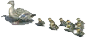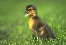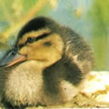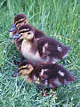 Dor harr de Familje würklich Dusel hatt. Dat duer gor nich lang, dor kunnen de Lütten al grünneln un dükern. Geev ja so veel to finnen un to freten, Grööntüügs, Koorns un Snicken, Kävers, Algen un ok mal 'n Reegenworm. Aver wenn se meud weern, denn klattert se bi Mudder op'n Rüch. So ameseert se sik nu all Dag buten op den Diek un warrn grötter un grötter dorbi. Tonacht krupt se mit ehr Mudder all tosamen in dat Reet.In de Mauser: dat achtern is de Erpel -- nu nich mehr so schillern bunt...