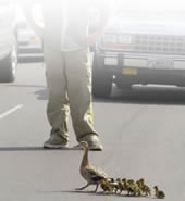 Da weern bloots noch poor Drüppen Woter in'n Tümpel. De letzten Weken harr dat wenig regent. Wat nu? De Keerl weer al gistern wegflegen, aver Mudder wusst Raat. Se wackelt mit ehr Göörn an de Autostraat, stunn dor un töövt un töövt. Dor keem en Motorrad, en Poolezist is afstegen. De hett de Familje över de Straat bröcht, dor in de Nehg weer en blanken Diek mit anner Aanten.