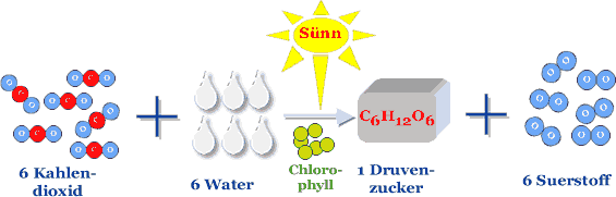 De Druvenzucker is natüürlich dat Foder för de Plant; he warrt to Kahlenwaterstoffkeden, to Plantenmasse wiederverarbeit. De Suerstoff is för de Plant man bloots en lästiges Nevenprodukt. Dör de Photosynthese kümmt so üm un bi allens, wat wi to'n Leven hebbt. Wenn wi Planten eet Kantüffeln t.B. orr Deerten, de tovöör Planten eten hebbt, dennso eet wi Sünnlicht. Un den Suerstoff, den atent wi in. Ahn de Planten geev dat keen Suerstoff; ahn ehr kunn also keen Deert un keen Minsch leven. Wi eet also nich bloots dat Sünnlicht, wi atent dat ok. Un wi fohrt dorop spazeern: Denn dat Eerööl, dat den Kraftstoff för uns Autos un Fleegtüüch levert, is nix as afstorven Deerten- un Plantenmasse ut verleden Tieden! Luft, Eten, Energie allens is Sünnschien. Jedeen Johr nehmt de Planten üm un bi 200 Milliarden