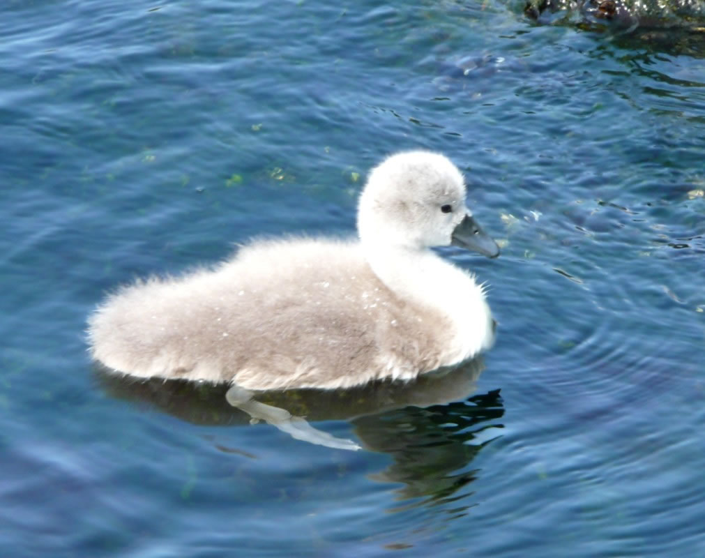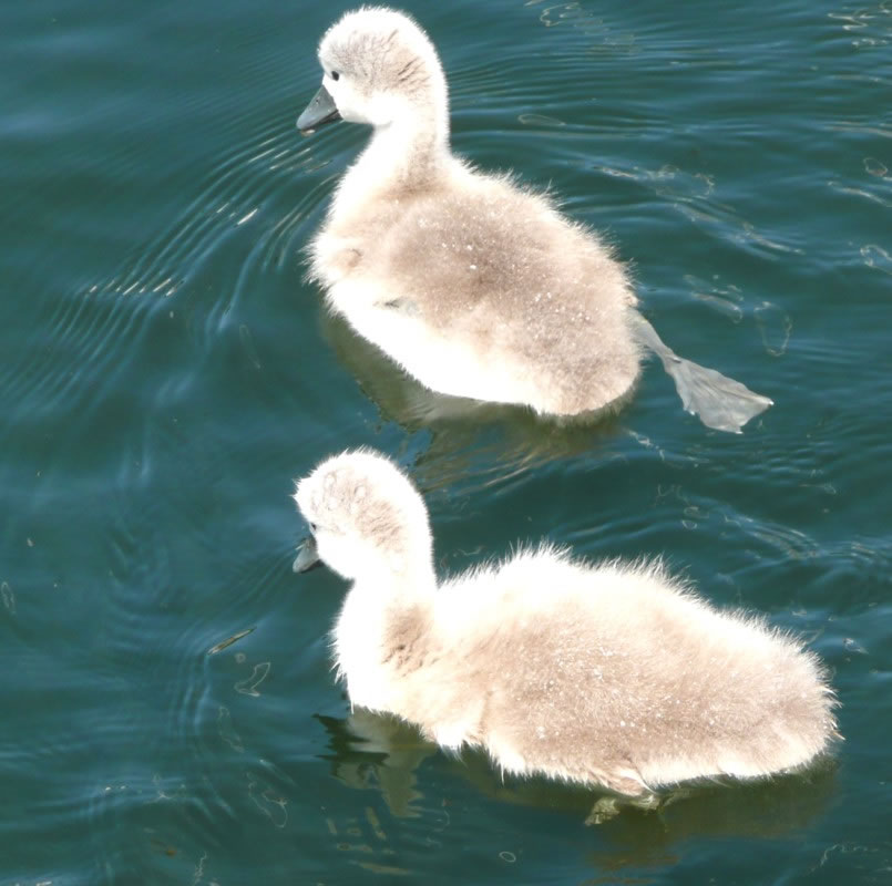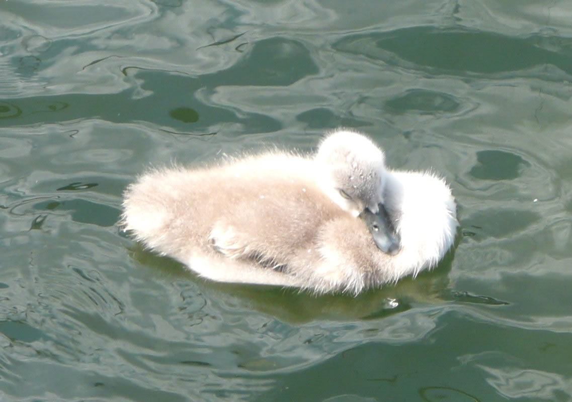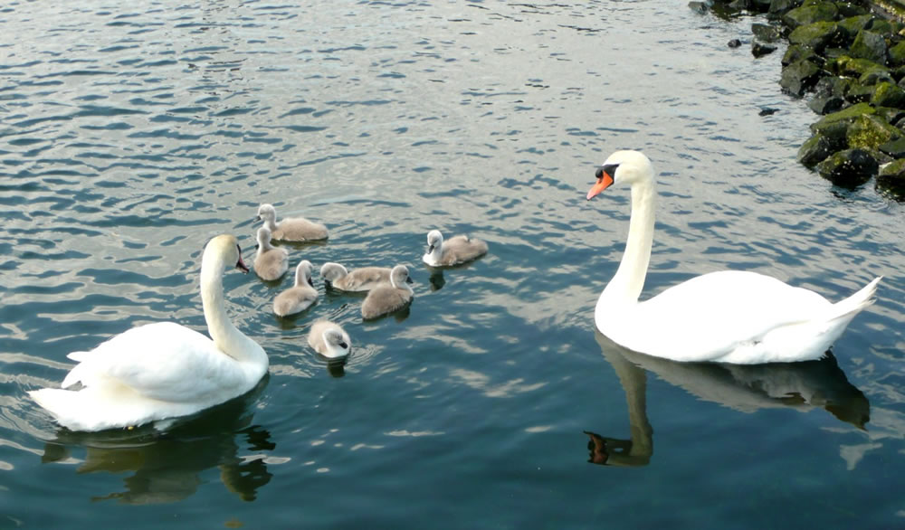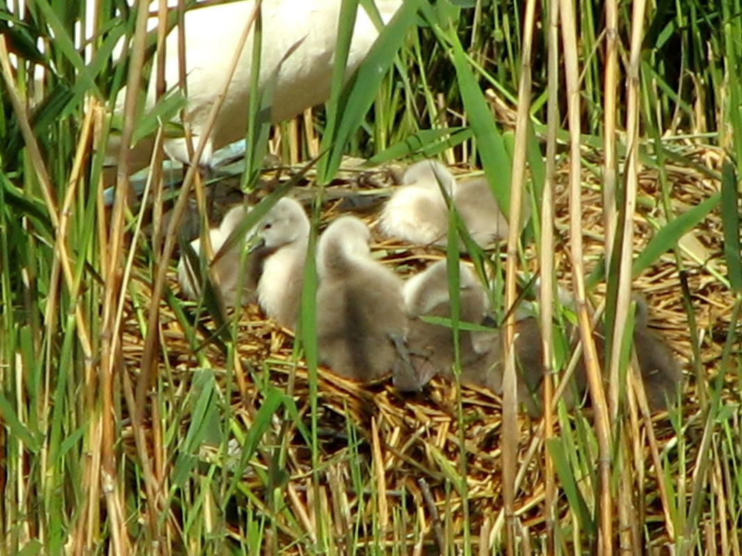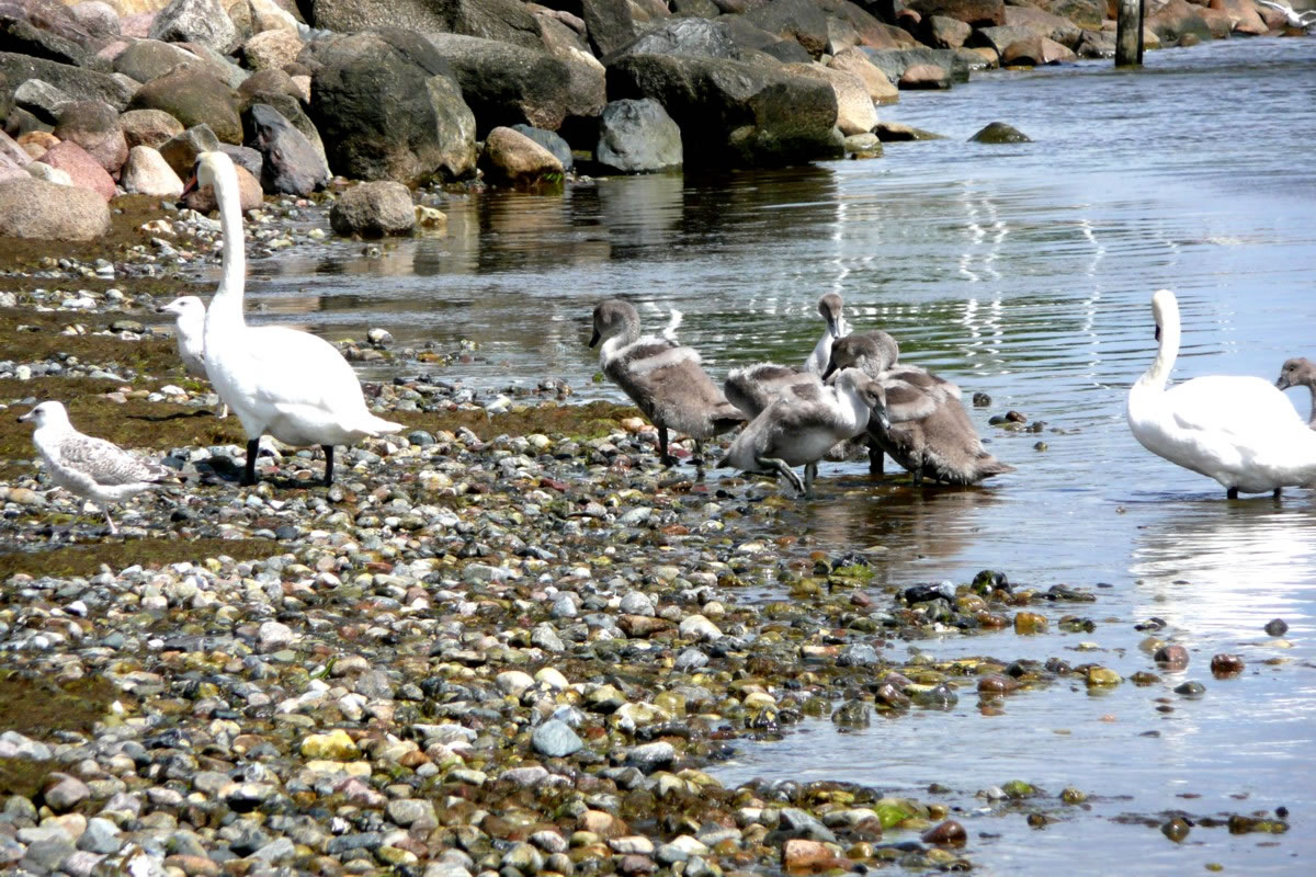 Över een Week sünd se nu al up de Trav. Se sünd in de Twischentiet al ornlich wat gröter woorn. Mi will dat ümmer noch nich in'n Kopp, wosück de Swaanfamilie dat schafft hett, bit in de Trav to kamen. Aver de lütten Aanten loopt ja ok oftins en groot Stück över Land achter de Modder her, bit se dat grote Water funnen hebbt. Nu bün ik neescherig, up Swaana un Swaanrich in't tokamen Johr wedder na den Karpendiek kaamt un dor ehr Eier utbröödt. Ümmer noch draap ik de Swaans mit ehr söven Kinner. Mitünner sünd se up de Trav an'n Jachthaven un mitünner ok an den Strand. Se sünd al düchtig ranwussen. In Kiellinie swimmt se, den Kopp up den slanken Swaanhals in de Hööcht reckt, altohoop över de blage Oostsee. Dat is smuck antokieken. De stolte Vadder vörut un Modder achterna.