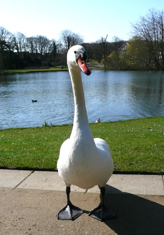 Küken al dor. De Aanten trocken mit en groot Dor harr ik aver mien Reken ahn Swaanrich maakt. Mit eens keem he an Land un glieks up mi to. Zisch mi an un sloog sien groten Flünken üm miene Been. Mi wöör angst un bang un dat dünn ok richtig dull weh. Ik kunn mi gor nich so gau ut'n Stoff maken. Ik reep na mien Mann üm Hölp. Aver he wöör ok vun den Swaan attackeert. Sowat harrn wi noch nich beleevt! Wedder to Huus, heff ik eerstmal mien Been bekeken. An annern Dag