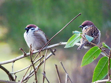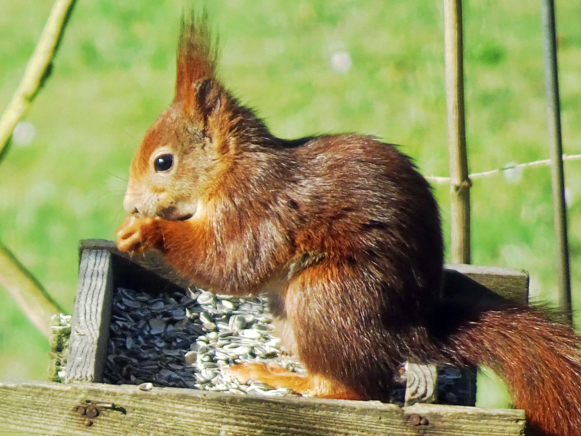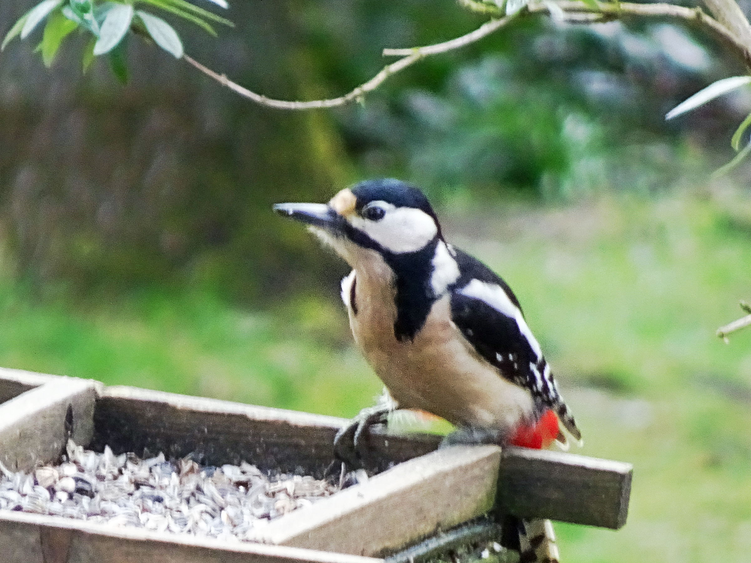 Tschilpen. Herr un Fro Specht kiekt bi dat Vagelfutter vörbi.