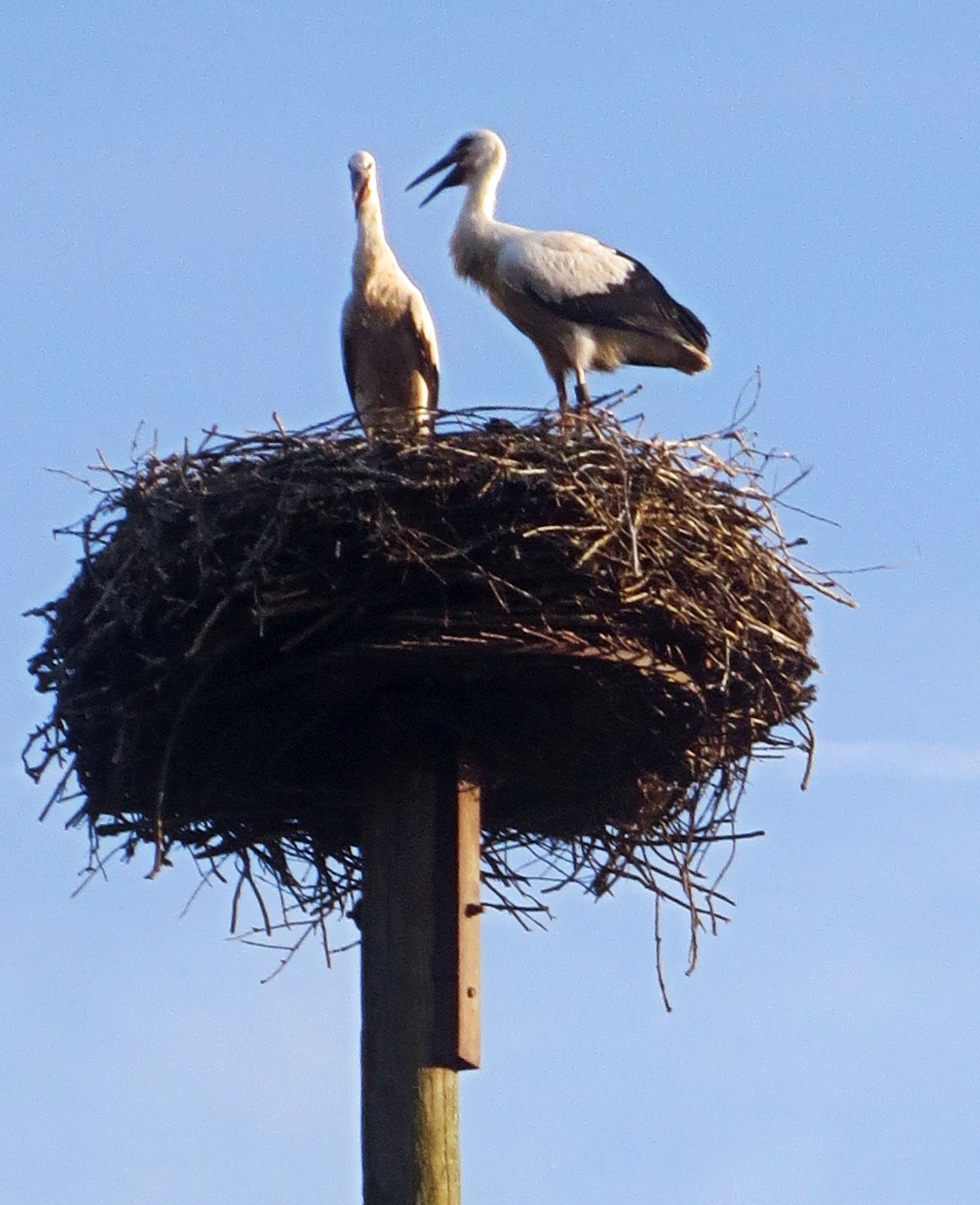 Wat – fröher as sünst? Ja, de Kalenner seggt, dat weer noch Winter. Aver de eersten Störk sünd al ut'n Süden trüch. Un ok een vun uns Störk worr al Anfang Februor op de Weid blangen dat Storkennest sehn. Un denn, rechttiedig to'n Valentiensdag, is ok de tweete an sien Teel ankamen — un beide hebbt sik forts doranmaakt, dat Nest hertorichten. Nu, üm de Oostertiet, sünd beide Störk op dat Nest to sehn un dat schient, as weern se ok al an't Bröden. Un dat wi uns Freid an jüm hebbt un ok en beten stolt sünd, markt een al doran, dat wi vun „uns Storkenpaar“ snackt.