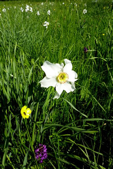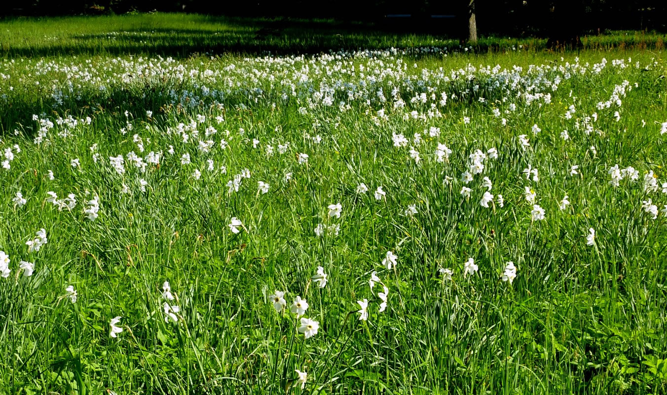 Verleden Johr heff ik al wat över den Zippelpark schreven. Nu kümmt noch en Toogaav. Wi harrn al den Maimaand tofaten. De gelen Zittlööschen weern verblöht. Aver de witten lüchen noch ut dat gröne Gras vun de so nöömte "Narzissenwiese". Sehg ut, as wenn sik dor en wittes Laken över den Zippelpark utbreedt harr. De söötlich Ruuch vun de witten Zittlööschen steeg mi in de Nees. De enkelte Blööt is besünners smuck. "Is dat nich en Gedicht?", ward oftins seggt. Heet se dorüm villicht ok "Dichter-Narziss"? Se blöht wat later as de gele Zittlöösch. Wi hebbt se ümmer as echte Zittlöösch betekend. Se wasst enkelt ut en Zibbel up enen kräftigen Stengelschaft. In de Meern vun de witt Blööt sitt en geel-rod farvten Kelk. De verströömt den kräftigen Ruuch. To Huus is se egentlich in den Mittelmeerruum. De Zippel vun de Bloom is bannig giftig. 'n beten wieder lang in de "Narzissenwiese", achter de witten Zittlööschen, keken ut dat hoge Gras dicke lila Blödenstännen. Dicht an dicht seten de smucken lila Blöden an enen Stengel. Dat weern luder Orchideen. Den Naam vun de Blööm wüss ik noch ut mien Schooltiet: "Breitblättriges Knabenkraut"oder "Geflecktes Knabenkraut". Wi kennt se aver ok as Kuckucksbloom.