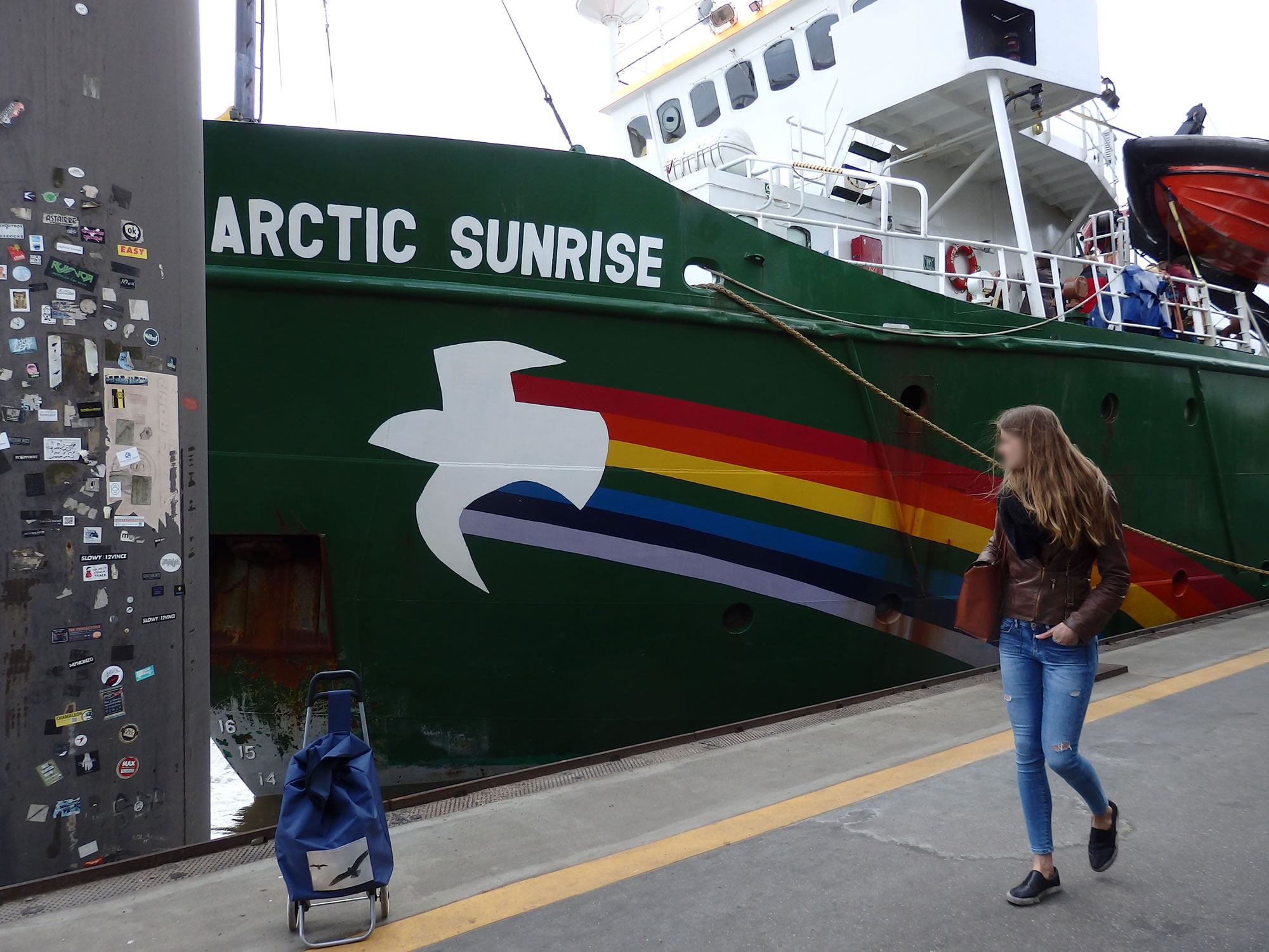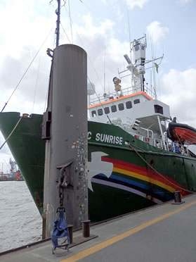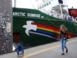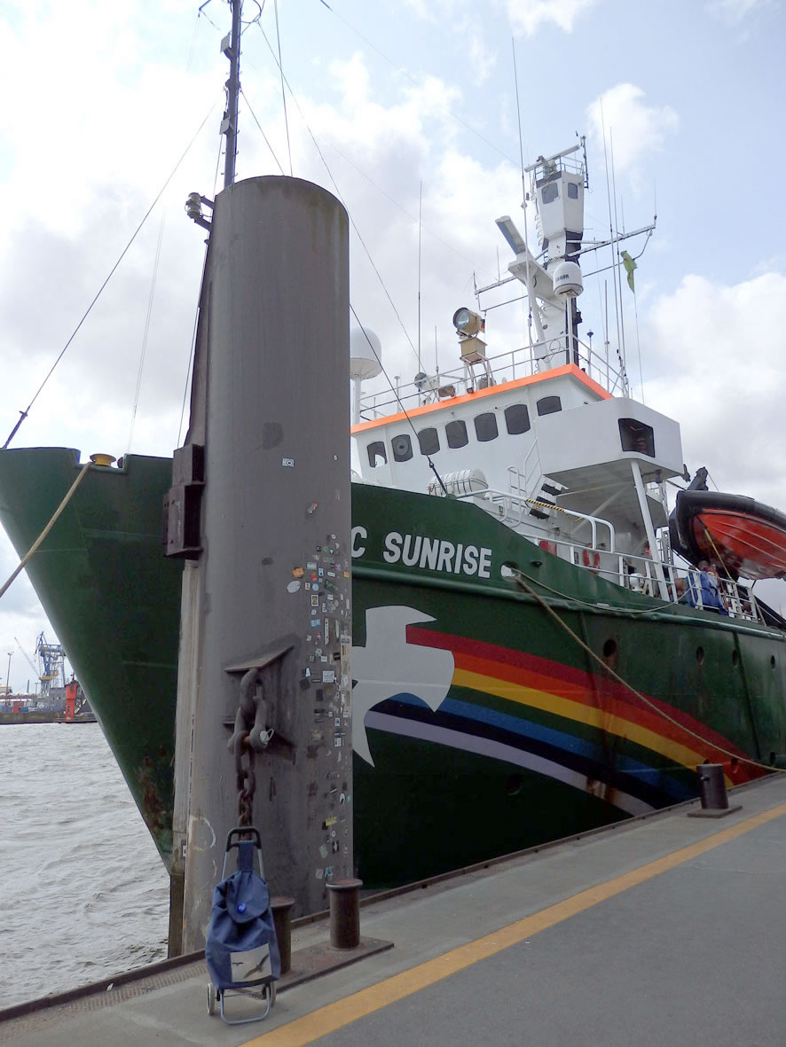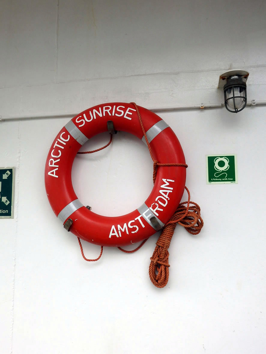 De Arctic Sunrise ward siet 1995 vun de NonProfit-Organisation Greenpeace nütt; de Heimaathaven is, as op'n Rettungsring to sehn, Amsterdam.