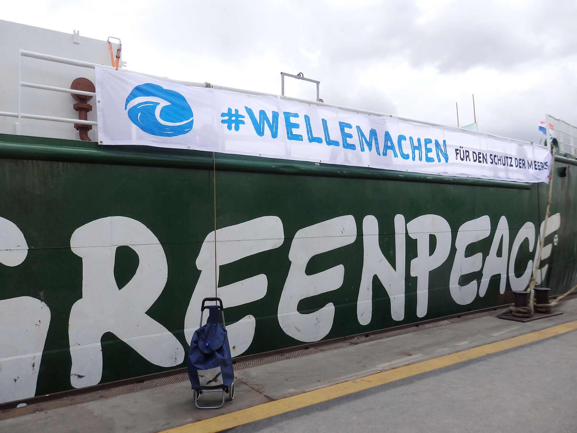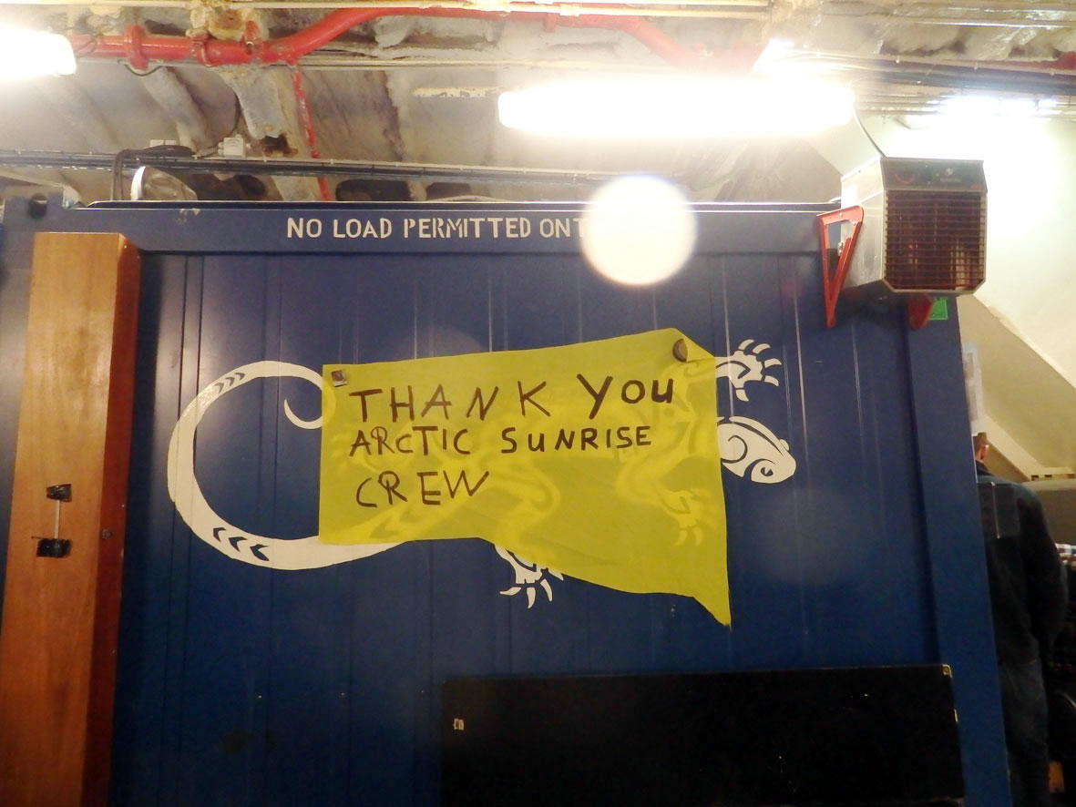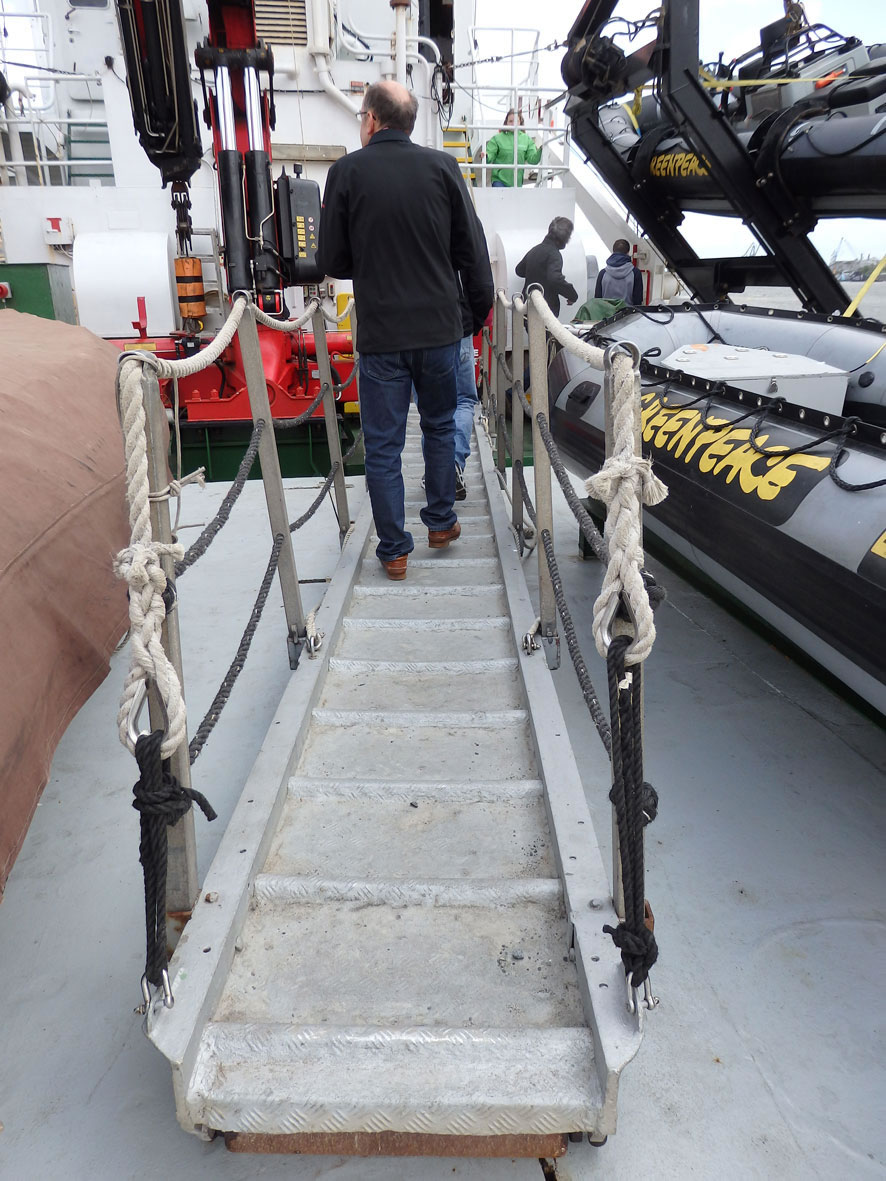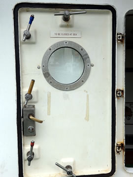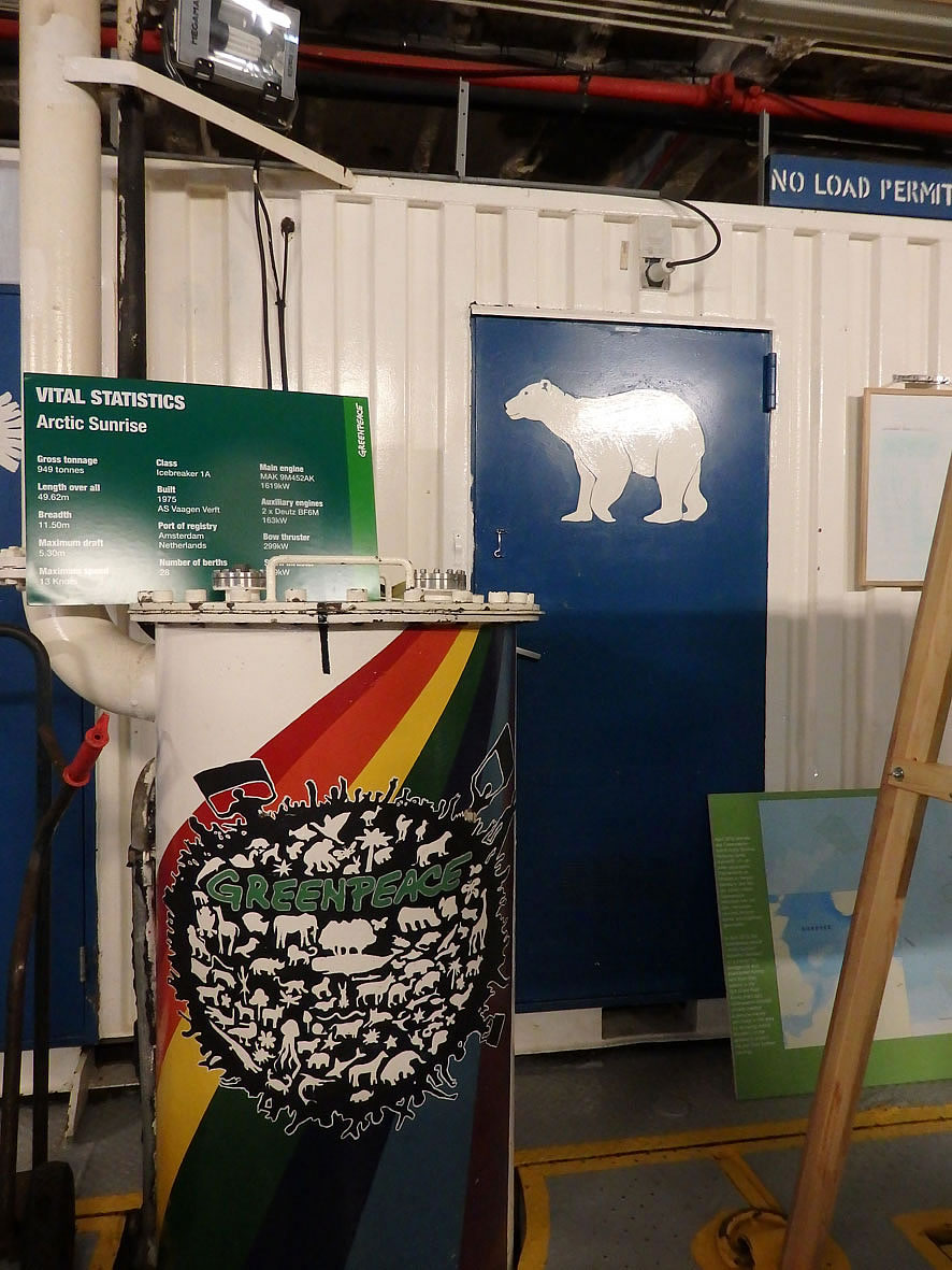 Buten weer en Döör: To be closed at sea. De Döör harr uk gode Dichtung un en Barg Griffe. Dor warrt di klor, dat dat op See jümmer heel eernst is! Op düsset Foto is noch eenmal de Utsichtsturm to sehn. As ik wedder vun dat Schipp gung, heff ik dat Glieke seggt as düsset Schild in den Frachtruum! Greenpeace hett uk 'n multimediale Duurutstellung in de Hafencity, Hongkongstraße 10. Natüürlich köönt Se bi'n Kulturlotsen wat doröver lesen. Ankieken lohnt bestimmt! Jüst as düsse Besöök op den Iesbreker.