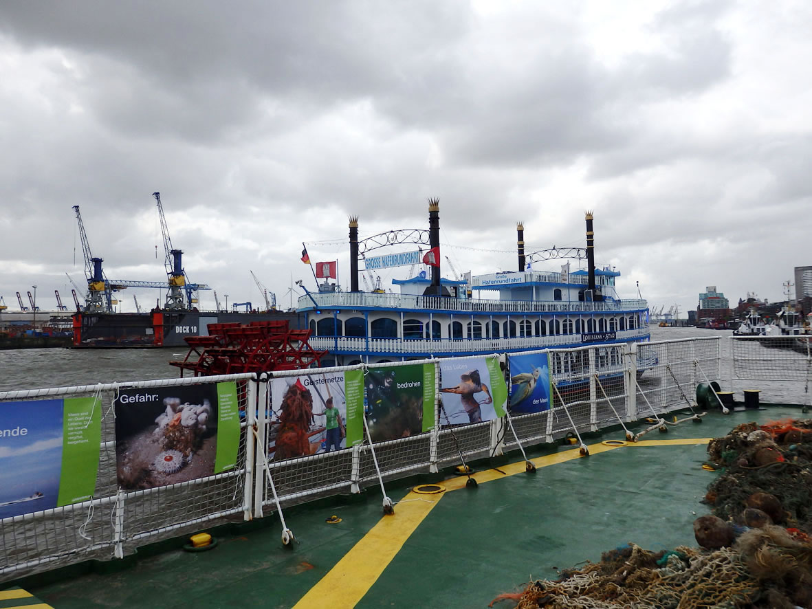 Saak maken, dat is mien Ding! Un denn gung dat los. Toerst sünd wi rechte Siet en Trepp hochklattert, un de junge Fru vun Greenpeace hett uns de Netten wiest. De meisten vun de Netten sünd nich mehr ut Hanf, sünnern ut Plastik un ward Geisternetten nöömt. Dat hett sienen Grund: Hanf verrott nämlich noch, düsse Netten aver nich. Allens över düsse Netten is op de Website von Greenpeace to lesen.