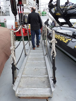 An Bord vun de "Arctic Sunrise" sünd natüürlich uk en poor Slauchbööt, de ward mit en Kran to Water laten.