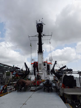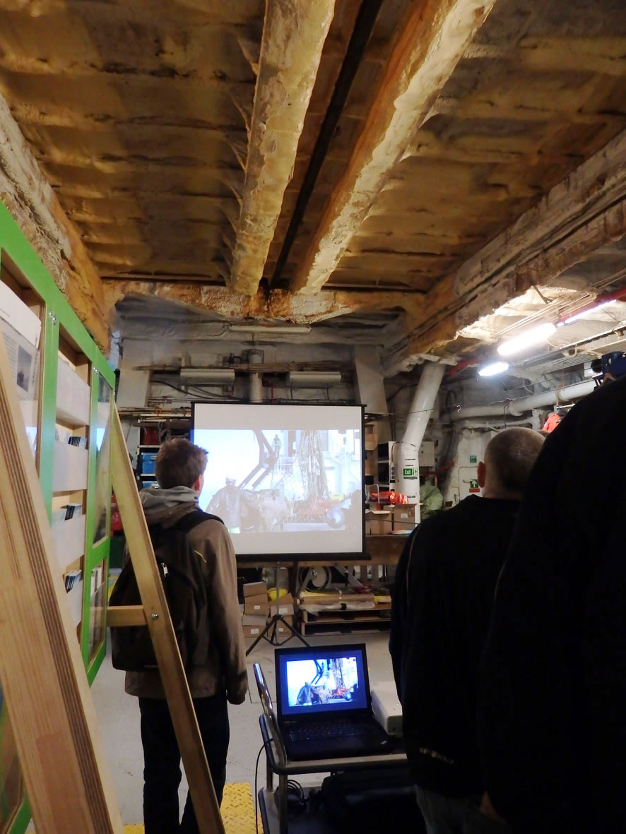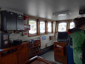 Op'n Weg na de annere Siet sehg ik den hoogen Utsichtsturm, wo een vun de Besatzung hochklattern mutt, üm to'n Bispeel in de Arktis to kieken, wo in dat veele Ies en Weg is, dörchtokamen. Op düsset Foto sünd uk poor vun de velen Gerätschaften to sehn. De "Arctic Sunrise" is ja nich bloots en Iesbreker, üm dat Ies to breken, se is ok to'n Erkunden vun de arktische Ümwelt dor. In dat Föhrerhuus hett uns Kim, en jungen Mann ut Südkorea, de ganzen Apperaaten wiest un verklaart. De Böker un annere Saken in den Ruum sünd all fastmakt, denn wenn dat Schipp op See is, fallt sünst allens dörchenanner.