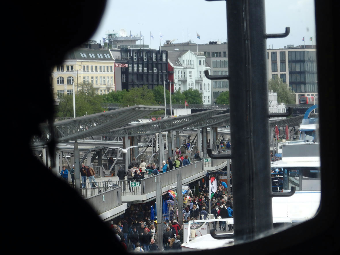 Ut de Finster kunnen wi uk de veelen Lüüd buten an de Landungsbrücken sehn. Dor töven uk al wedder welk op den nächsten Besichtigens-Törn.