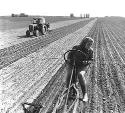 Tau dei Tiet geef noch kein monogerme Räuwensaat, so dat Hacken, Vertrecken, Rundhack usw. normal wiern un wi Kinner mössten mit ran. Tau Austiet wür tau mien Kinnertiet dat Kuurn noch mit dei Seis anmeiht, Vadder vörwech un ik taun Upbinnen vonne Garwen achteran. Låters harr hei 'n Grasmeiher mit Handaflåch, man mösst dei aflecht Garf blot noch upbinnen. Denn keem't Hocken, würn dei Hocken dörch Rägen tau natt, denn mössten's ümhockt warden, denn keem't Infohrn un up Miete setten, denn keem dei Wannerdöschkasten un man künn all anne Austköst denken. Œwer bald wier Tüffelsammeln un Tüffelrummeln ansecht, denn mössten noch dei Räuben von'n Acker un dat Winterkuurn all wedder inne Ierd.