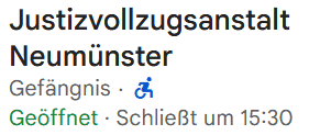 Leider hebbt dat de Insassen noch nich spitzkregen, bloots een plietsche Rollifohrer gifft Gas un haugt af, ehrdat üm Klock halvig veer wedder tomaakt warrt! De Minschen, de to Teihndusende in iranische Folterknäst sitt, wöörn to geern mal düsse Schangs hebben... |