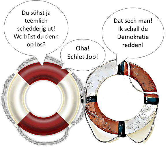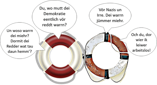 vun Behrend Böckmann 1961 hett männig Kinobesäuker dull schmüstert, as "Rette sich wer kann" in't Kino keem, 'n Film tau'n Schmüstern ut'e Leningrader Filmstudios. Teihn Tiger, twei Löwen un ein Ååp an Buurd von'n groten Frachter sorgen för väl Tumult ünner dei Besatzung un Gäst von't Schipp, so dat dei Taukiekers sik twei Stunnen gaut amüsiern künnen. An dissen Film möt ik ümmer denken, wenn hüt Poletikers versäuken, Demokratie in ehrn eigen Sinn tau redden. Dat güng all 2014 los, as uns hütig Mäkelnborger Landsmudder Manuela Schwesig in Berlin Bundsministerin för Billung, Fomilie, Senjoren, Frugens un Jugend wier un dat Programm "Demokratie leben!" in't Läben reep. 2014 güng't mit 40 Milljonen Föddergeller los, 2018 wiern dat all 120,5 Millionen Euro. Dat mutt denn je woll heiten, dat dei Demokratie ünner Rood-Gräun jümmer bedürftiger un swacker worrn is, nich? Un dei Föddersummen kladdern un kladdern, 2023 sünd dat 182 Milljonen un 2026 sünd dat ünner Merz sogor all 200 Milljonen Euro, denn hei glöwt, dat mit dit Geld sien Brandmuer tau den oppositschonellen linken un sünnerlich rechten Rand tau hollen is.